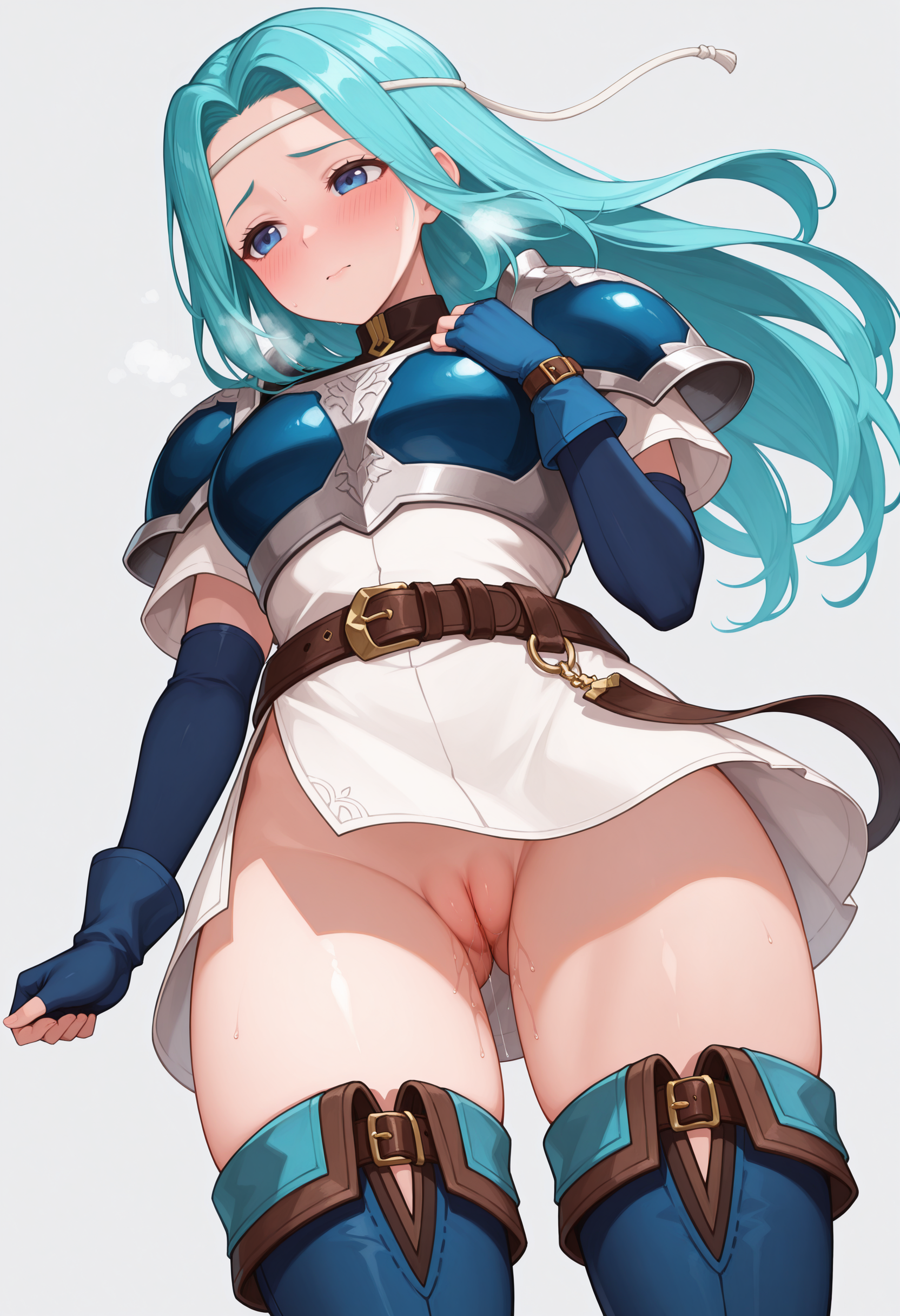 frff、青い目、水色の髪、長い髪、白いヘッドバンド、青い鎧、肩甲板、胸甲、白いドレス、短いドレス、青い手袋、肘まである手袋、指なし手袋、茶色のベルト、青いブーツ、太ももまでのブーツ