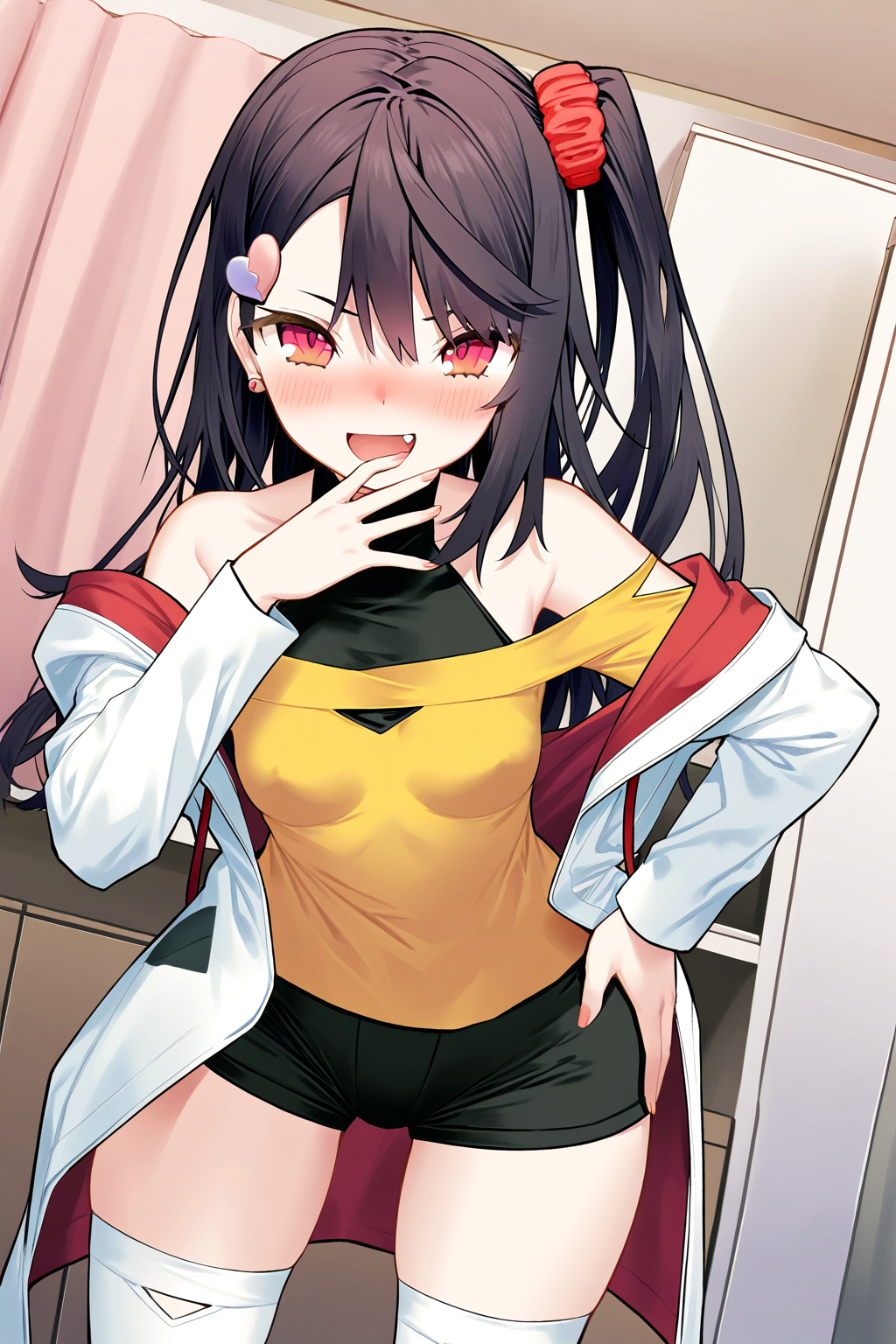 imt_def, ty_imt, 1소녀, 단독, 빨간 눈, 검은 머리, 긴 머리, 한쪽 올린 머리, 작은 가슴, 하트 머리 장식, 빨간 스컨치, 귀걸이, 어깨 노출, 칼라 헬터넥, 어깨 드리운 셔츠, 노란 셔츠, 검은 셔츠, 긴 소매, 흰 재킷, 열린 재킷, 검은 반바지, 흰 허벅지 양말,