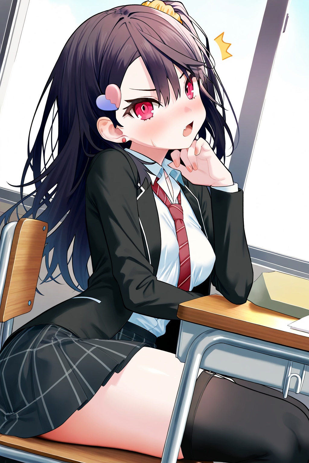 imt_unf, ty_imt, 1소녀, 단독, 빨간 눈, 검은 머리, 긴 머리, 한쪽 올린 머리, 작은 가슴, 하트 머리 장식, 노란 스컨치, 귀걸이, 검은 블레이저, 열린 블레이저, 흰 셔츠, 빨간 넥타이, 긴 소매, 검은 치마, 검은 허벅지 양말,