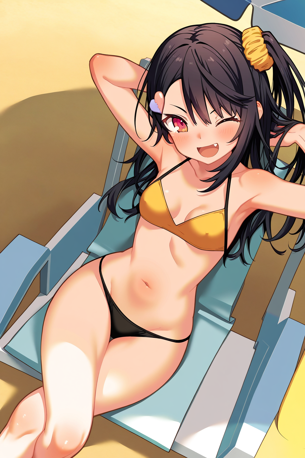 imt_swm, ty_imt, 1소녀, 단독, 빨간 눈, 검은 머리, 긴 머리, 한쪽 올린 머리, 작은 가슴, 하트 머리 장식, 노란 스컨치, 노란 비키니 상의, 검은 비키니 하의,