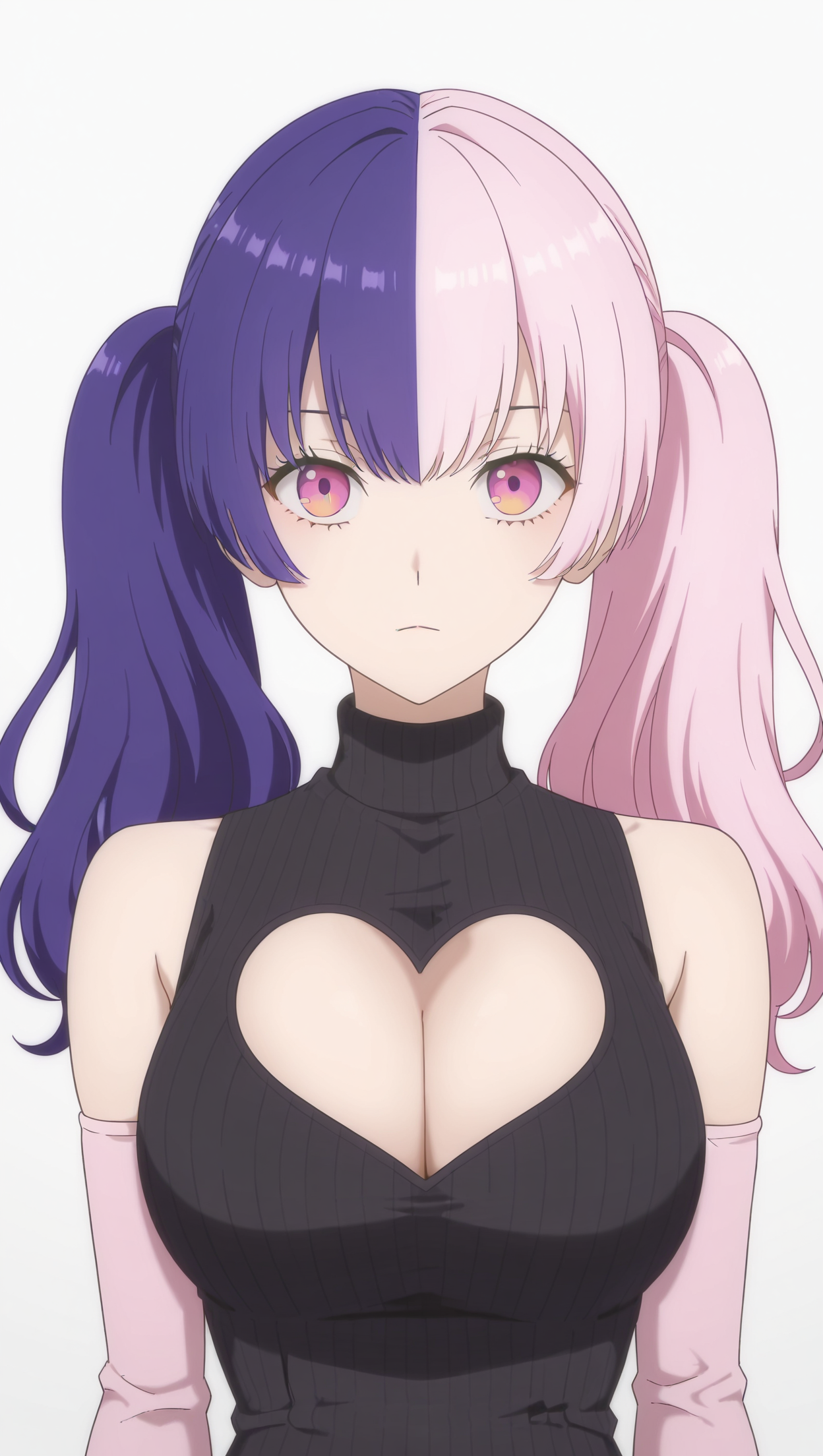 anime coloring, masterpiece, best quality, amazing quality, n4g0m1, 1girl, long hair, twintails, split-color hair, two-tone hair, pink hair, purple hair, pink eyes, turtleneck, sweater, black sweater, bare shoulders, cleavage cutout, heart cutout, large breasts, detached sleeves, pink sleeves, skirt, yellow skirt, leopard print, fishnet thighhighs, boots, black footwear, solo, pose, standing, looking at viewer, from front, ((((white background, simple background))))