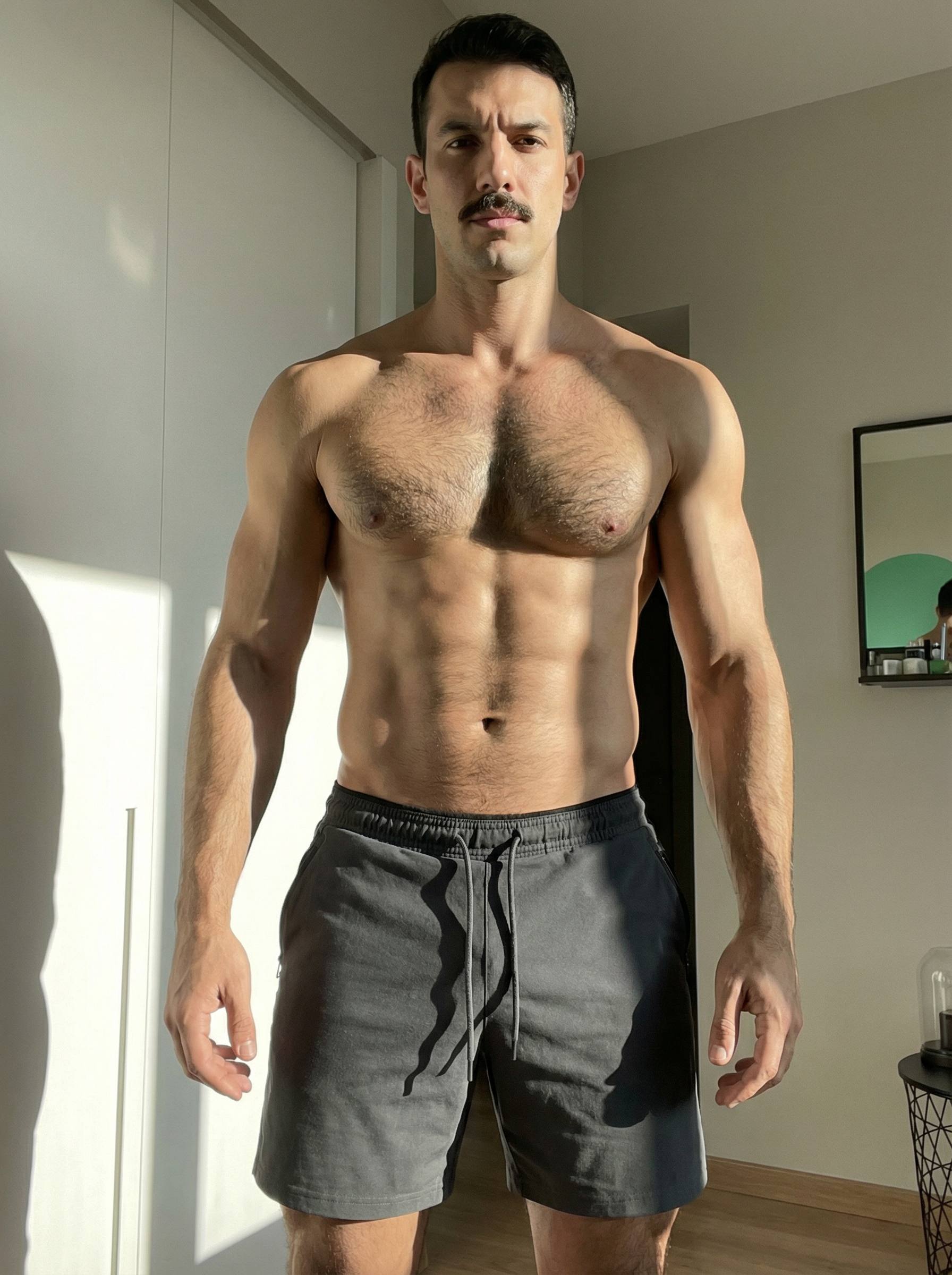 It focuses on an athletic and muscular physique, defined abs, broad shoulders, natural body hair, and confident facial features.