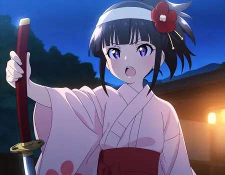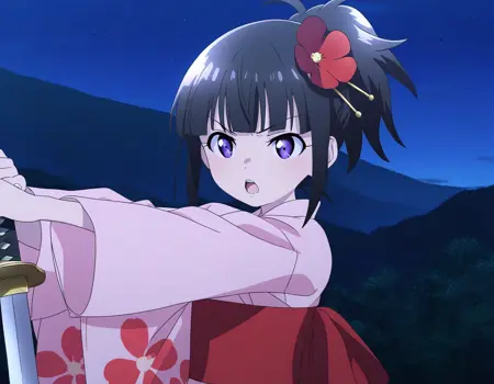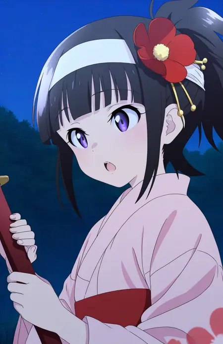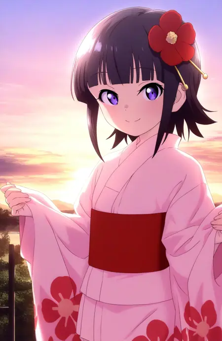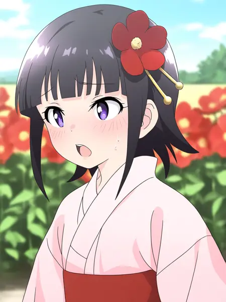 Suzu(Youkai_Enikki), 1girl, solo, hair ornament, purple eyes, hair flower, short hair, blunt bangs, red flower,