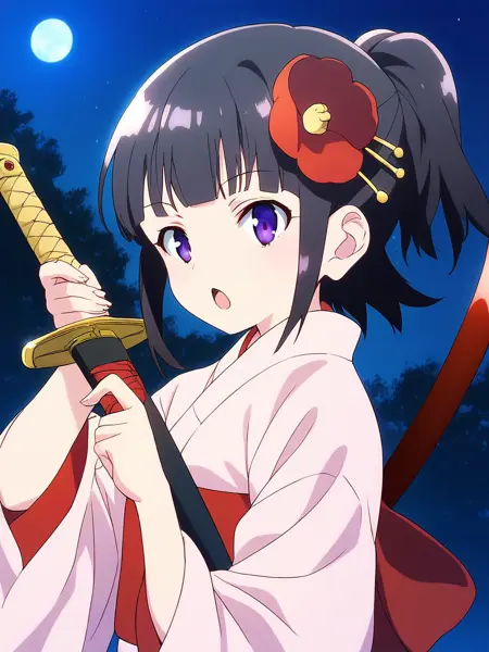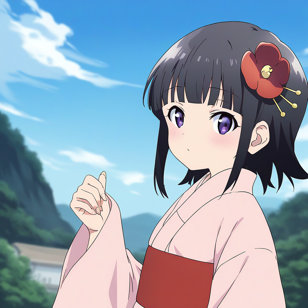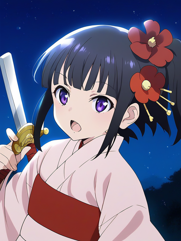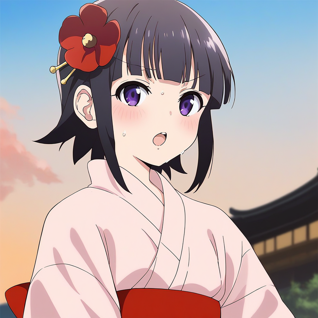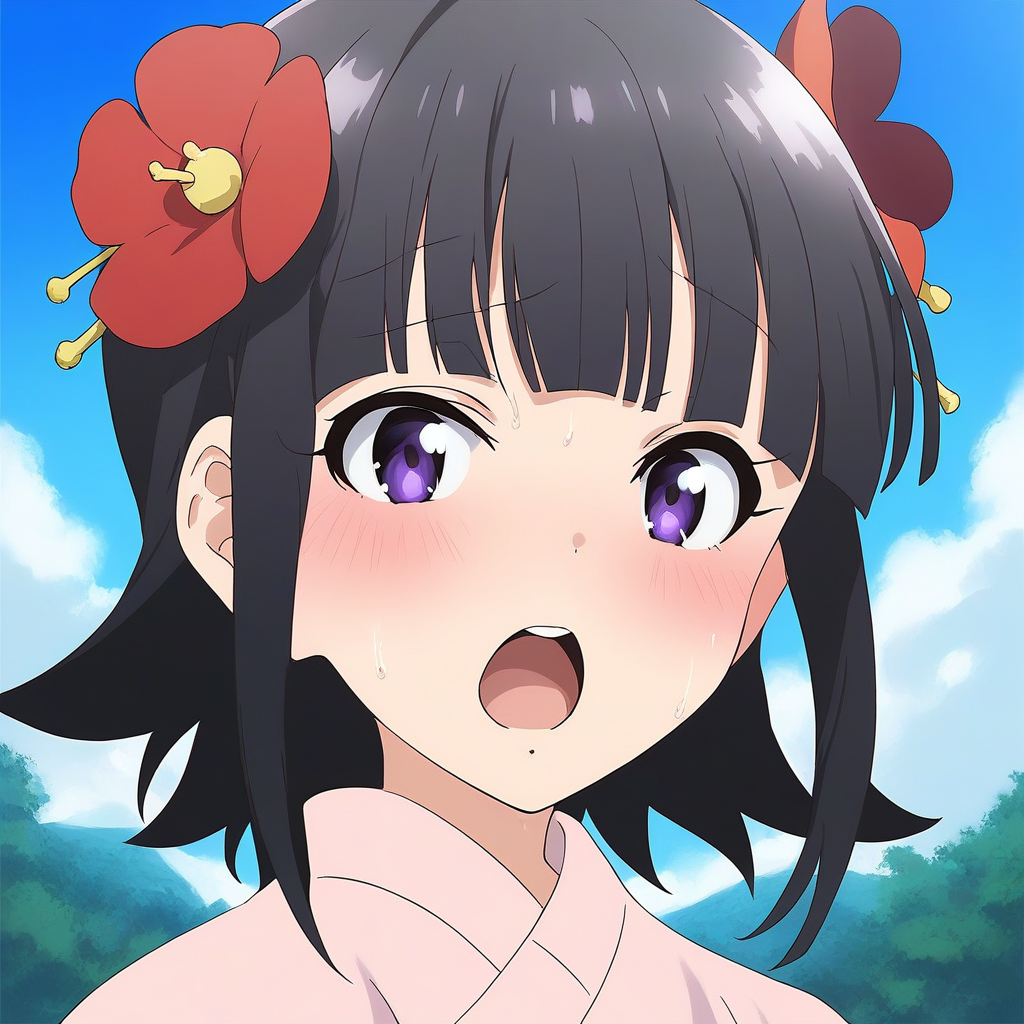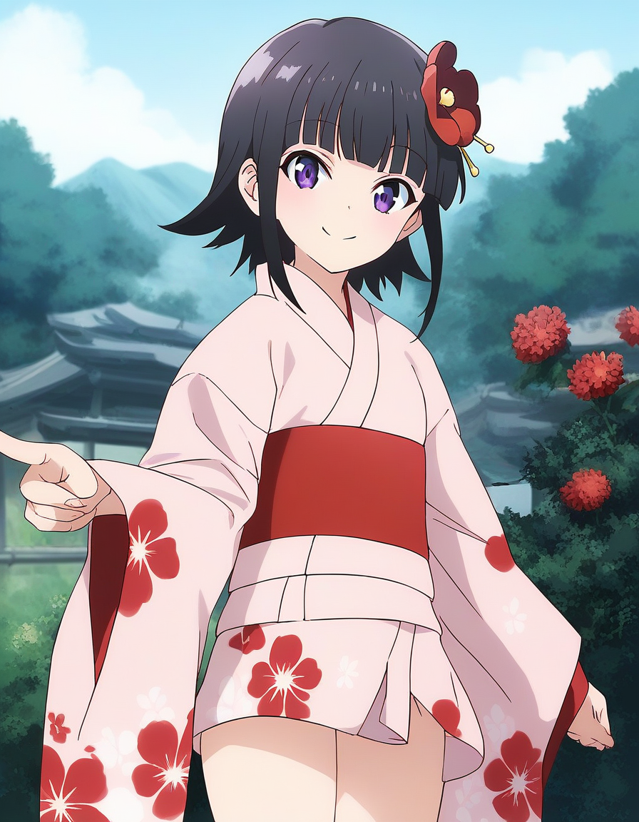 Suzu(Youkai_Enikki), 1girl, solo, 머리 장식, 보라색 눈, 헤어 플라워, 단발, 앞머리, 빨간 꽃,