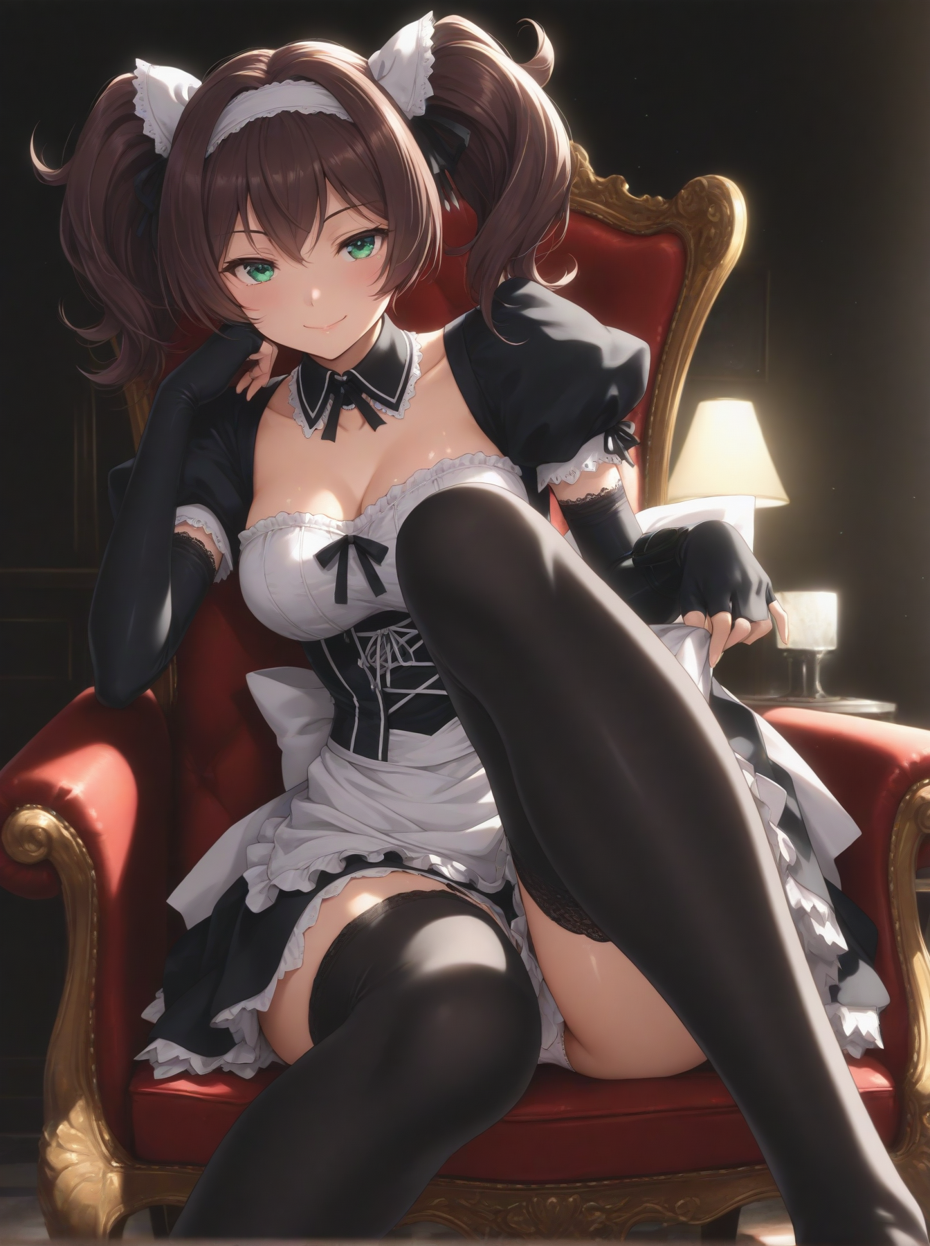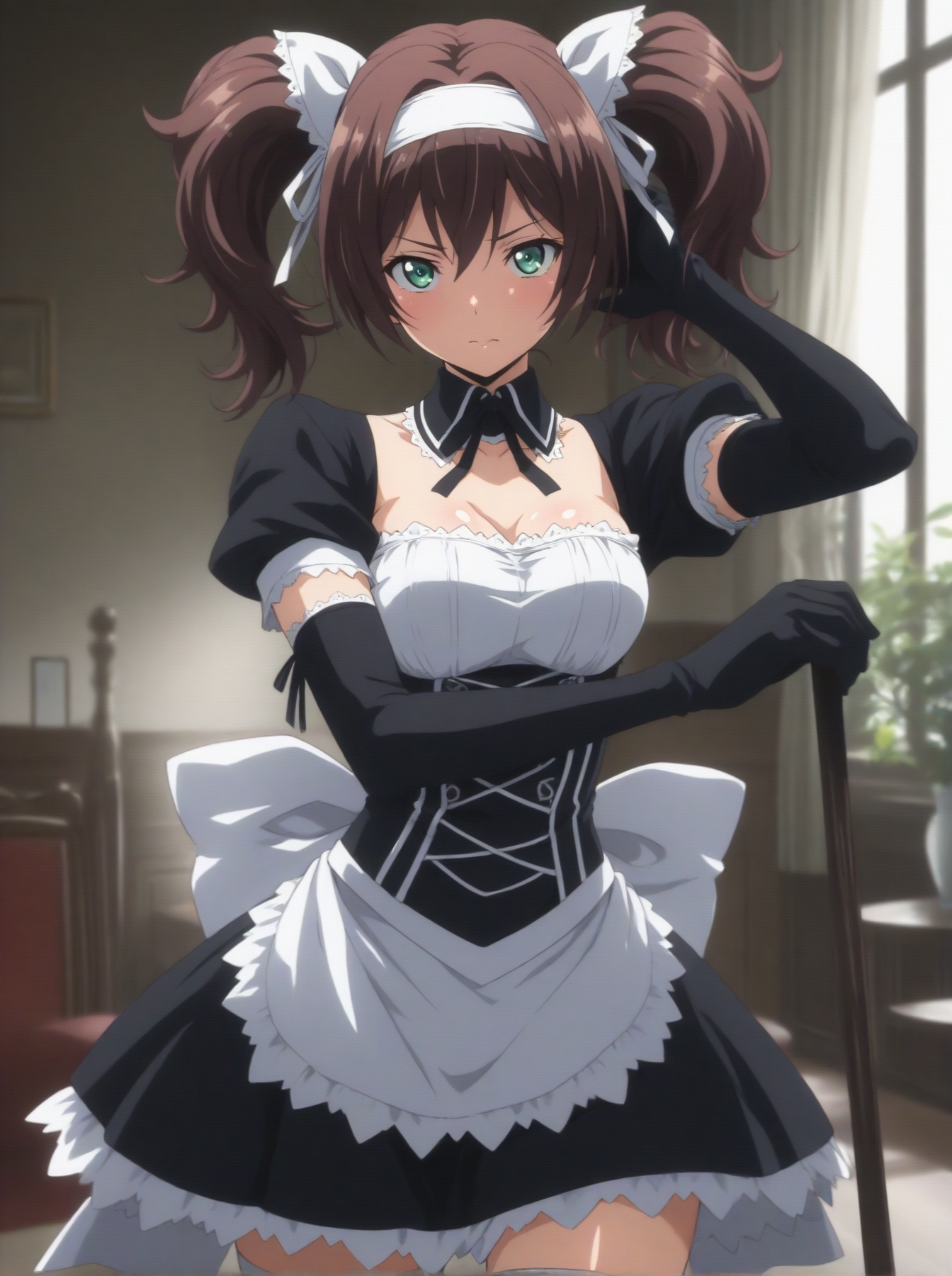 옷: (메이드 유니폼, 메이드 헤드웨어, (검은 분리형 칼라), (검은 손가락 없는 팔꿈치 장갑), 짧은 소매, 풍성한 소매, 흰색 뒷주름, 흰색 앞치마, 허벅지 길이 양말, 제타이 루오기)