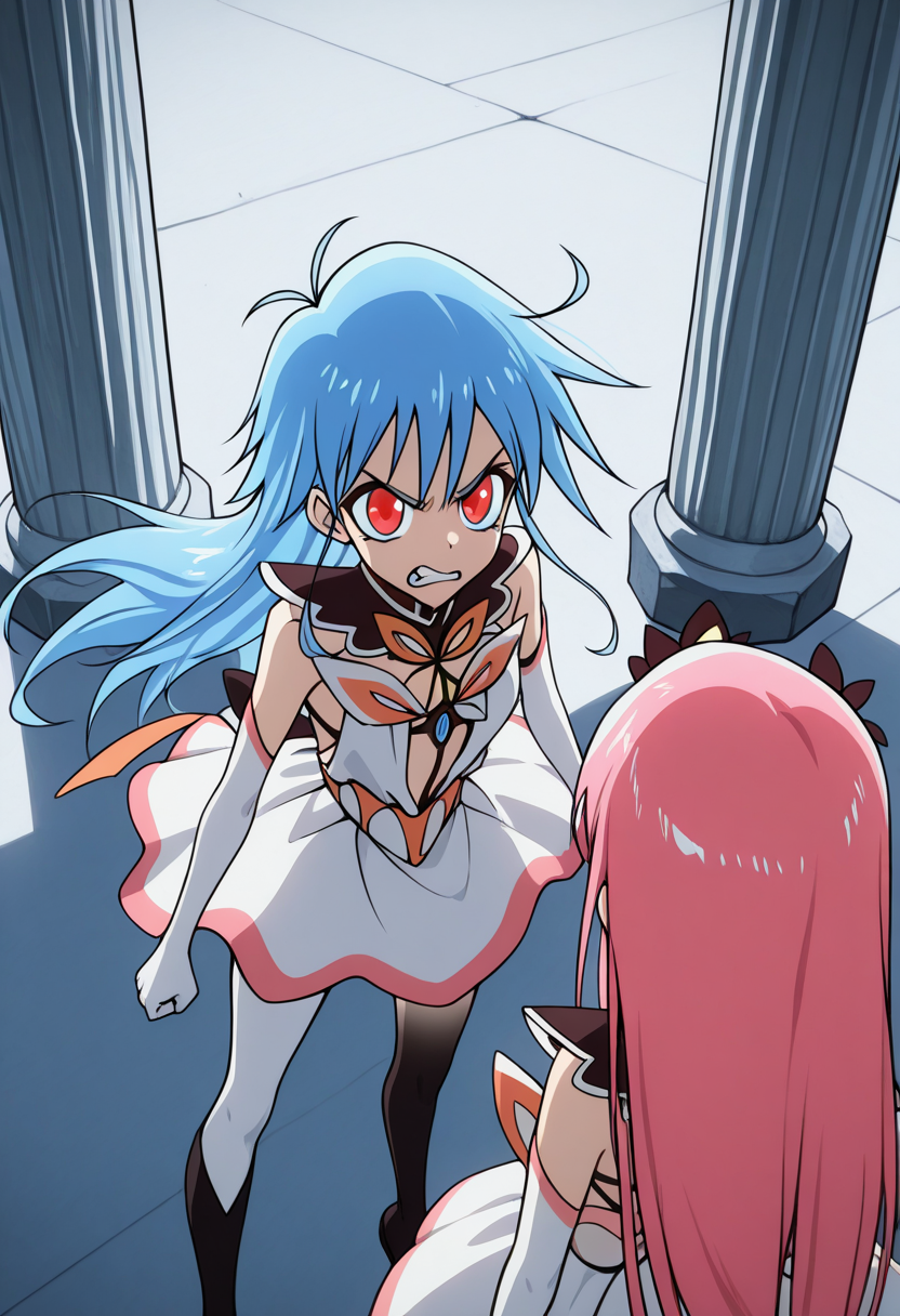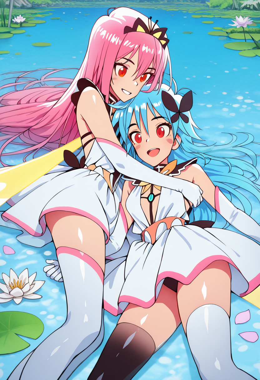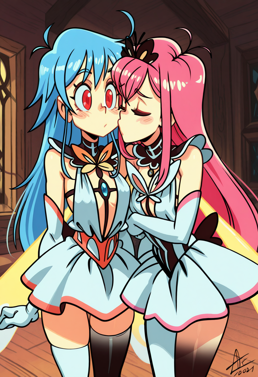 ヒロインたちのタイツは、特に角度のあるポーズやフルレングスの立ち姿と異なる場合、しばしば正しく描かれません。正しいイメージでは、片方の脚は白いストッキングと黒い靴、もう片方の脚はハイシューズで、上部が肌色に徐々に溶け込むようになっています。LoRAはしばしば片方の脚を単純に白、もう片方を単純に黒と描き、または複数のキャラクターが登場するシーンでは色の配置が混乱します。