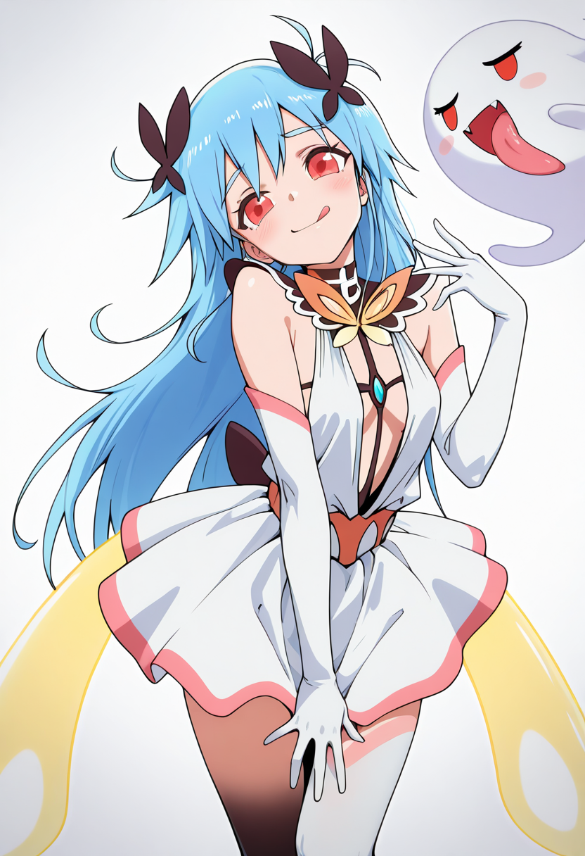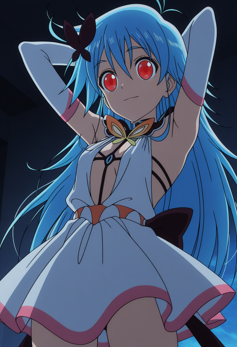 papikaflipdress, blue hair, red eyes, butterfly hair ornament