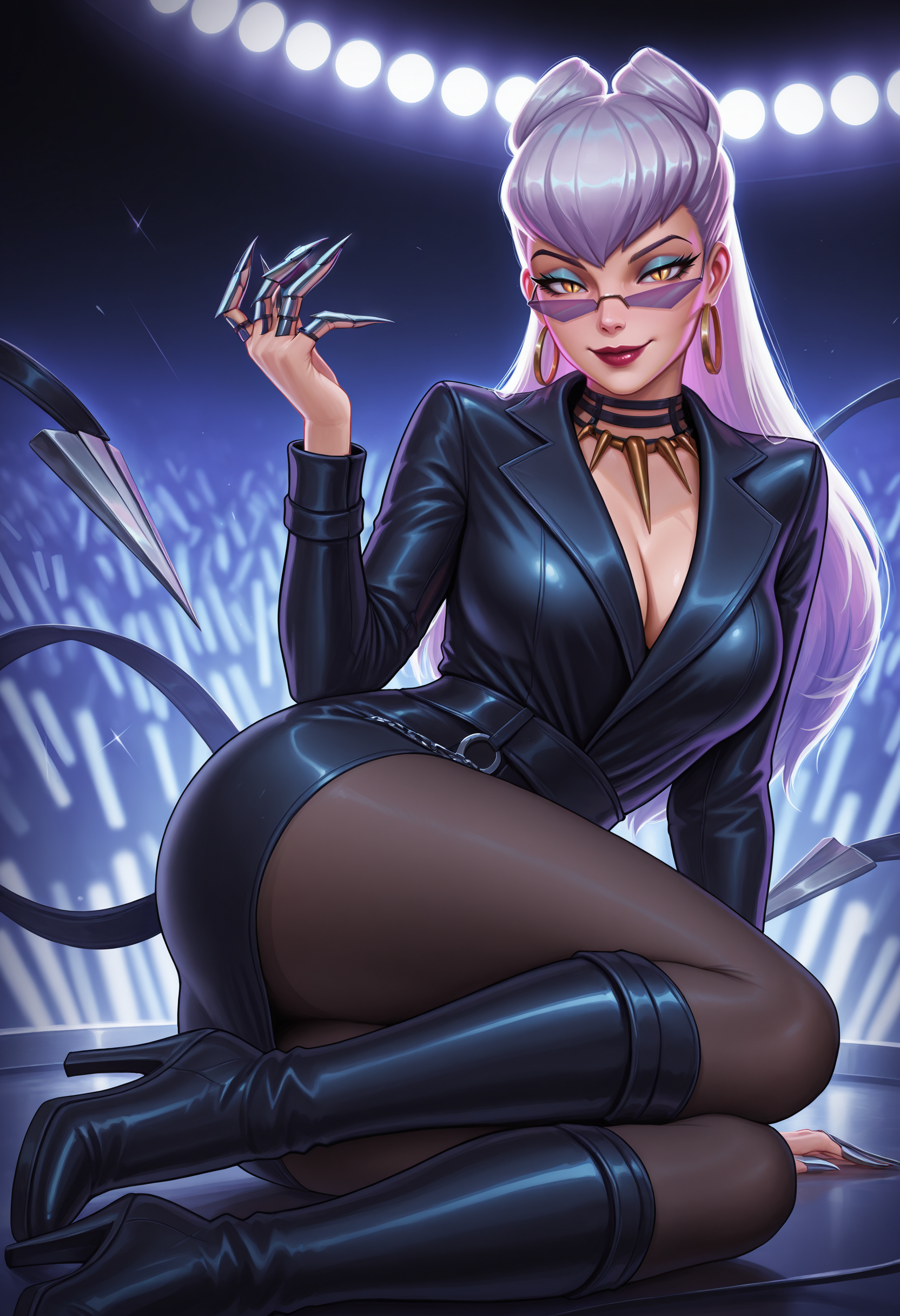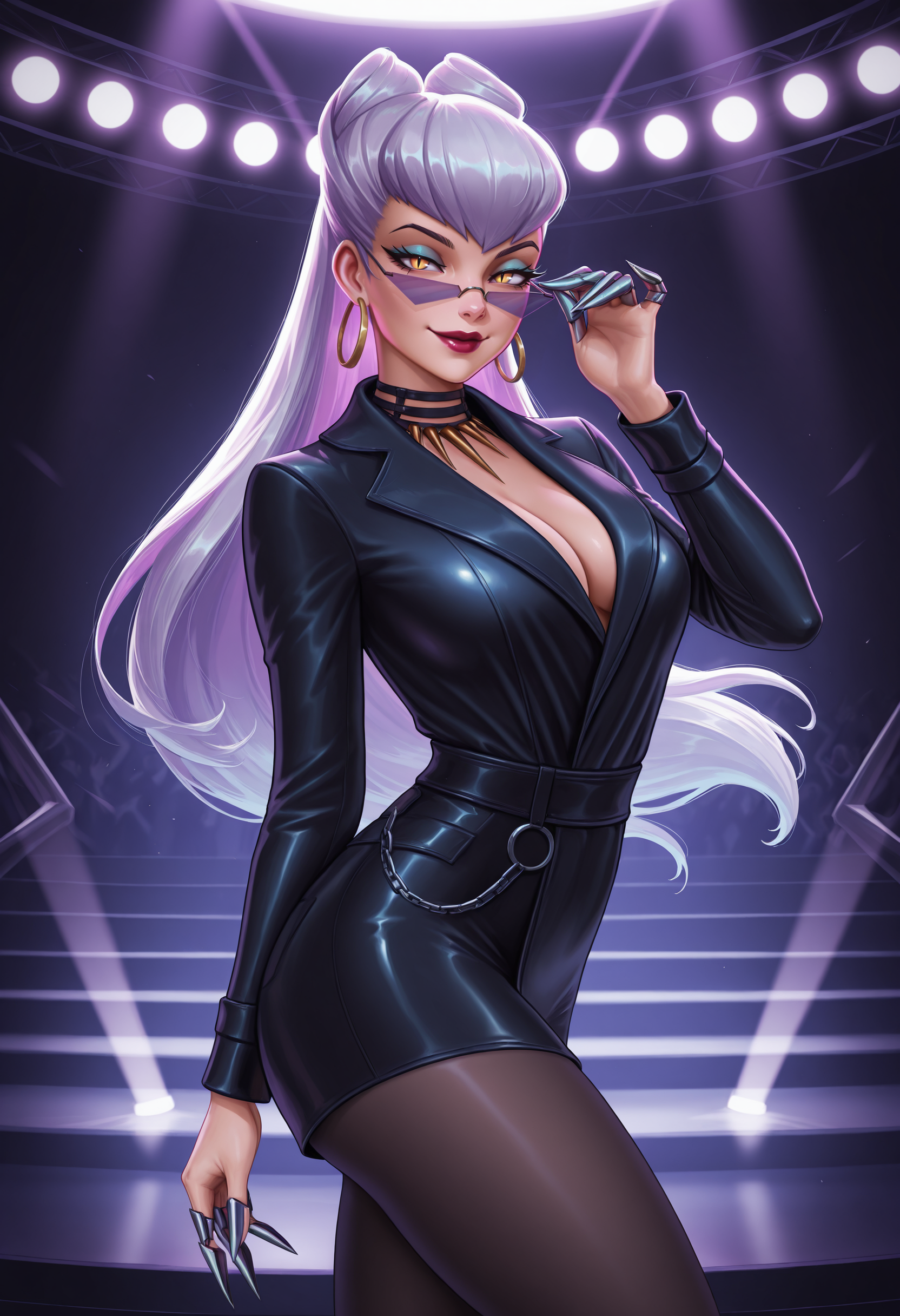 baddesteveil, 긴 머리, 흰 머리, 회색 머리, 포니테일, 보라색 머리, 더블 번, 원뿔형 번, 비대칭 앞머리, 노란 눈, 수직 동공, 파란 아이섀도우, 보라색 톤의 안경, 프레임 없는 안경, 빨간 입술, 고리 귀걸이, 보석, 금 귀걸이, 검은 초크, k/da (리그 오브 레전드), 큰 가슴, 악마 소녀, 이빨 목걸이, 검은 정장, 비즈니스 정장, 발톱 \(무기\), 재킷, 허벅지, 검은 스타킹, 검은 벨트, 반짝이는 옷, 검은 치마, 체인, 악마 꼬리,