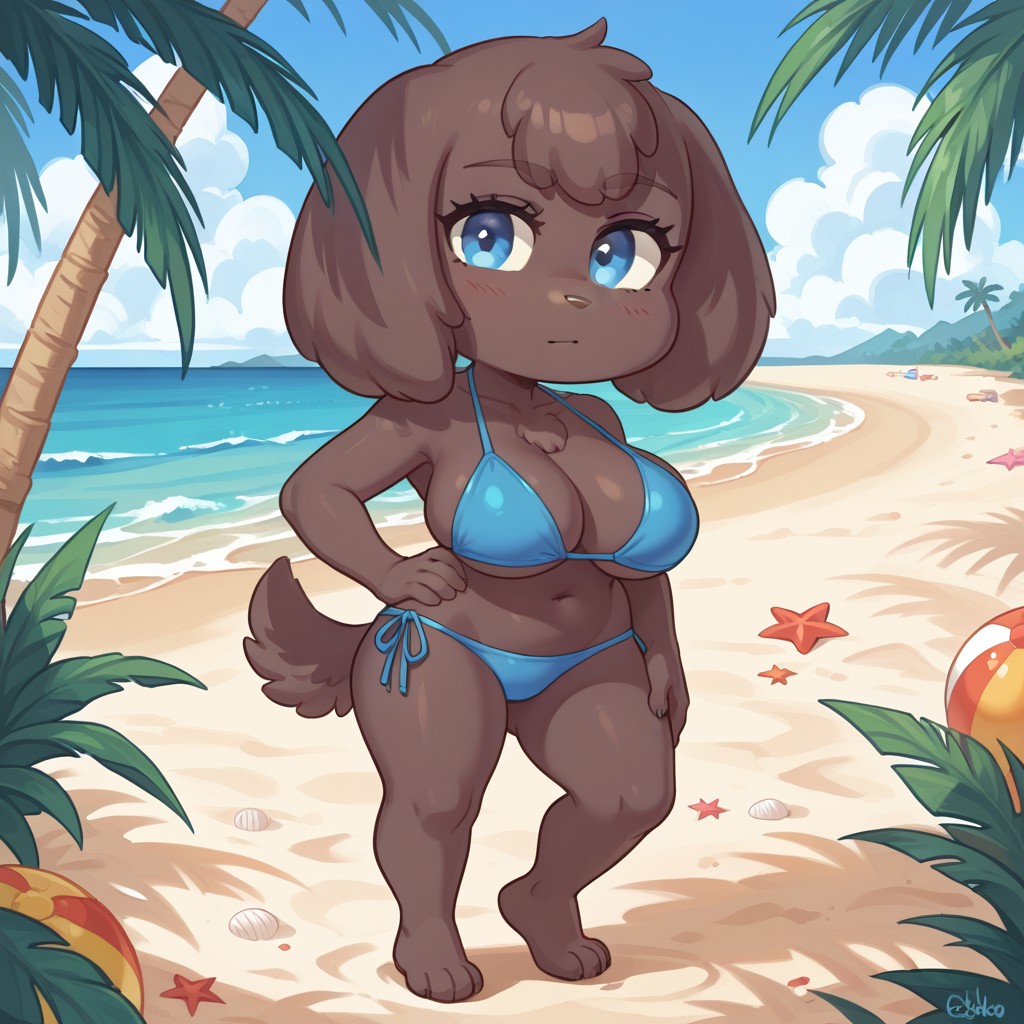 dog, dog girl, spaniel, brown fur, blue eyes, hair tuft, black nose, floppy dog ears, dog tail, shortstack,