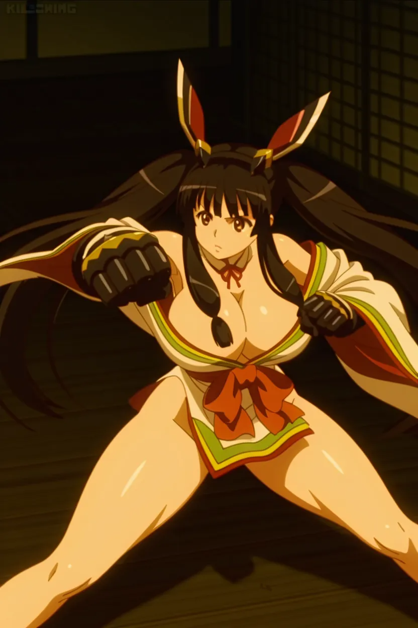1girl, Kaguya (Q.B.G), black hair, long hair, twin tails, brown eyes, glossy lips, thick lips, huge breasts, queens_blade_art_style, HD, 4k, High-resolution, Excellent-Quality, No-Flaws, clean animation