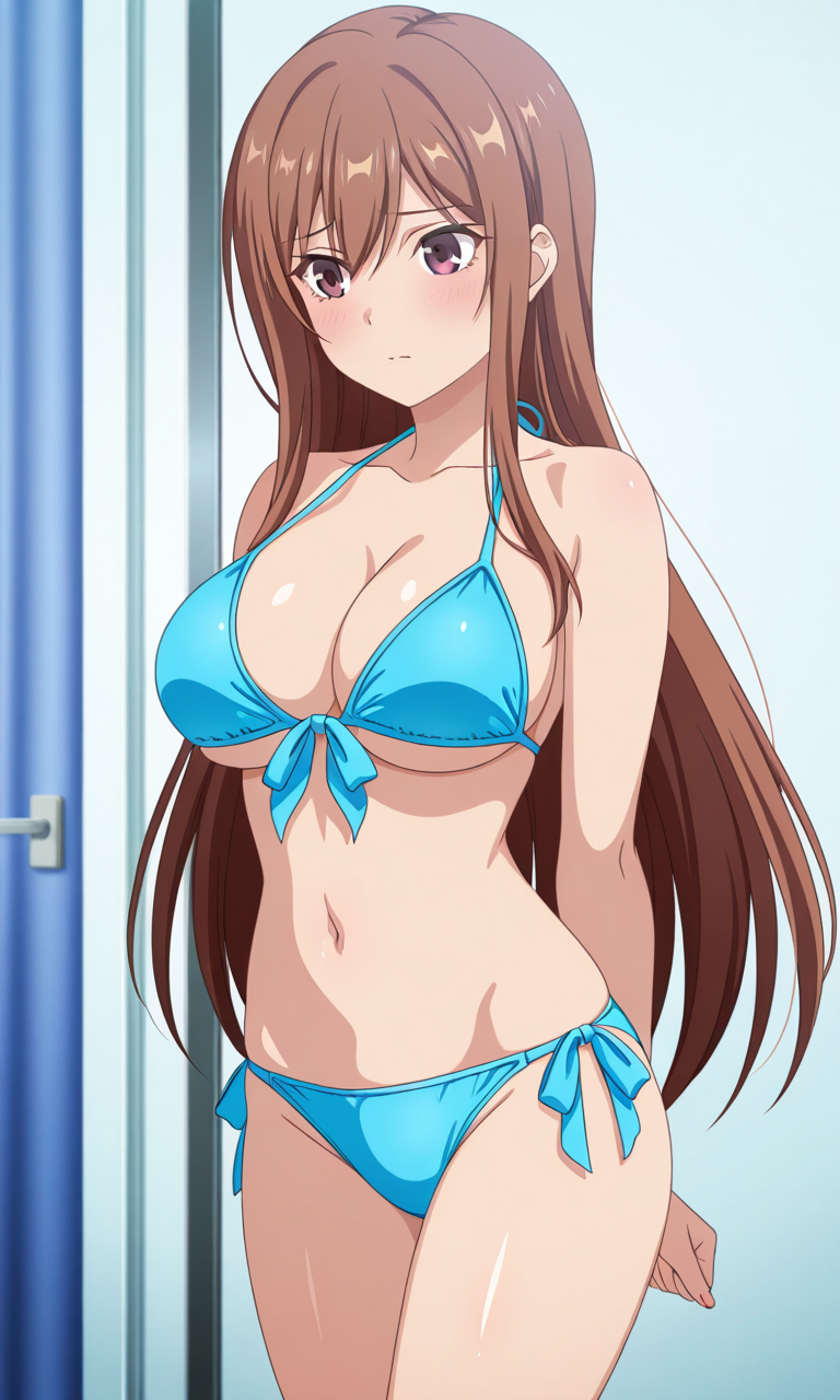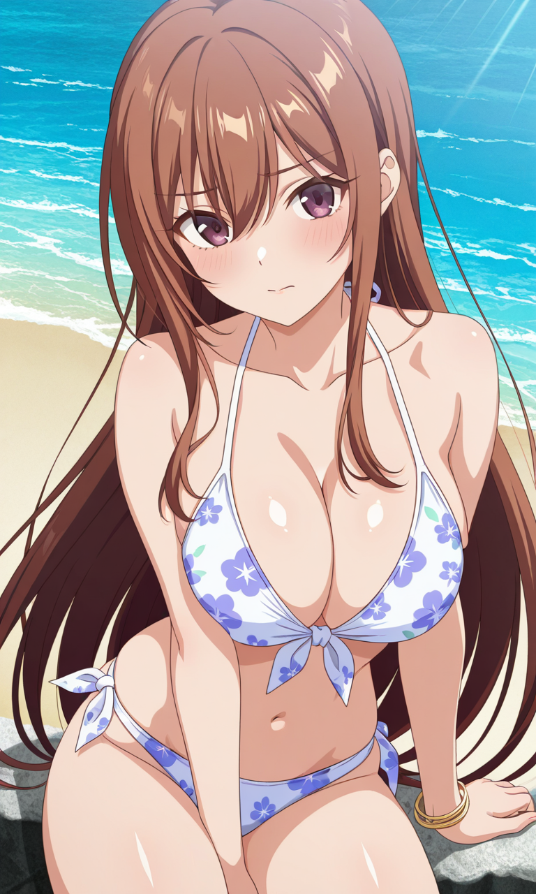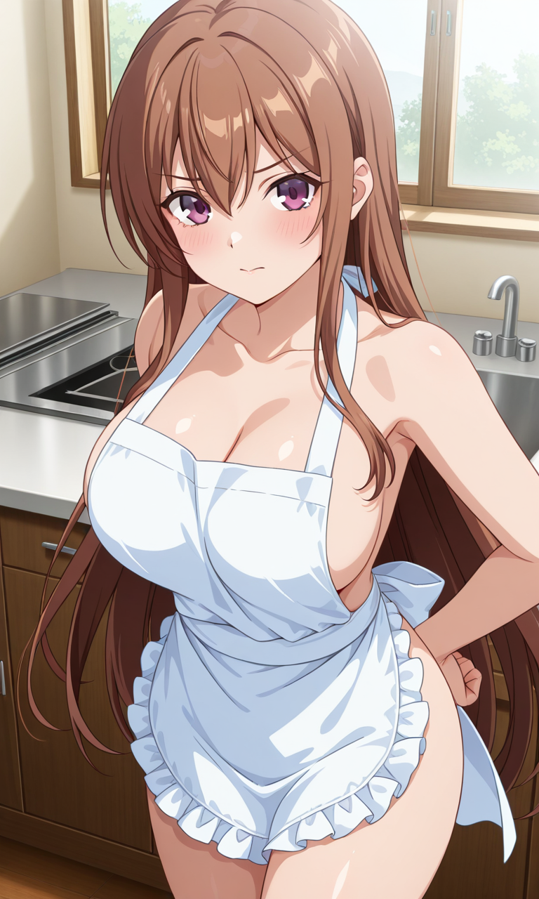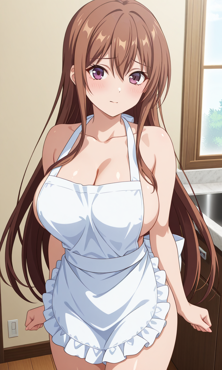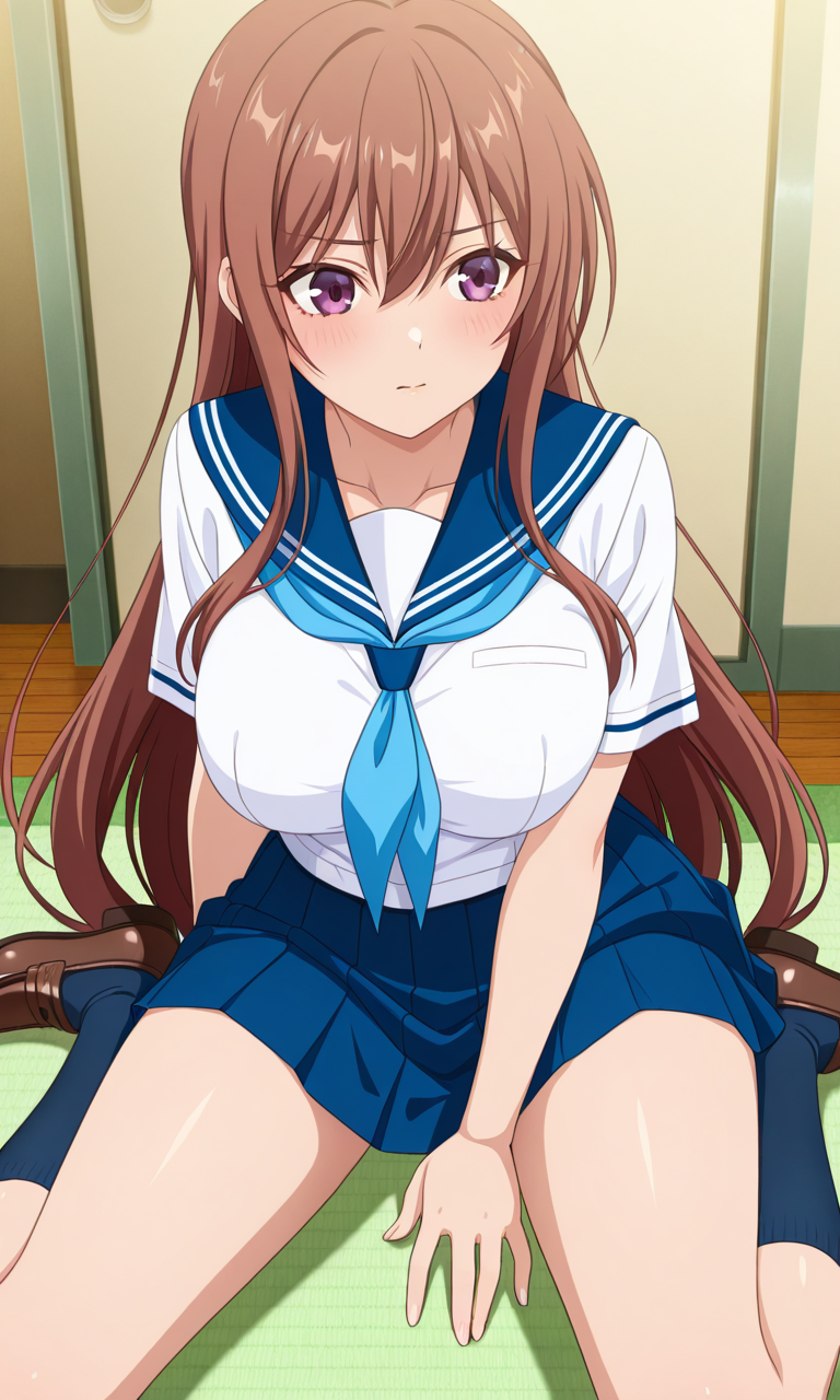 시라카와 아야네 (오버플로우), 1소녀, 싱글, 긴 머리, 가슴, 큰 가슴, 갈색 머리, 갈색 눈, 보라색 눈, 허벅지, 매우 긴 머리, 눈 사이의 머리카락, 측면 머리카락, 애니메이션 컬러링,