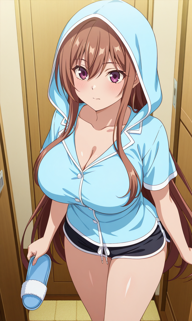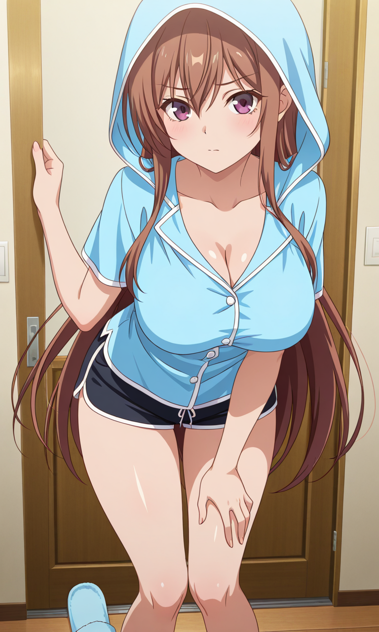 반바지, 가슴 사이, 쇄골, 후드, 후드티, 슬리퍼, 파란 셔츠, 긴 소매, 셔츠, 후드 끌어올림, 파자마, 짧은 소매, 검은 반바지,