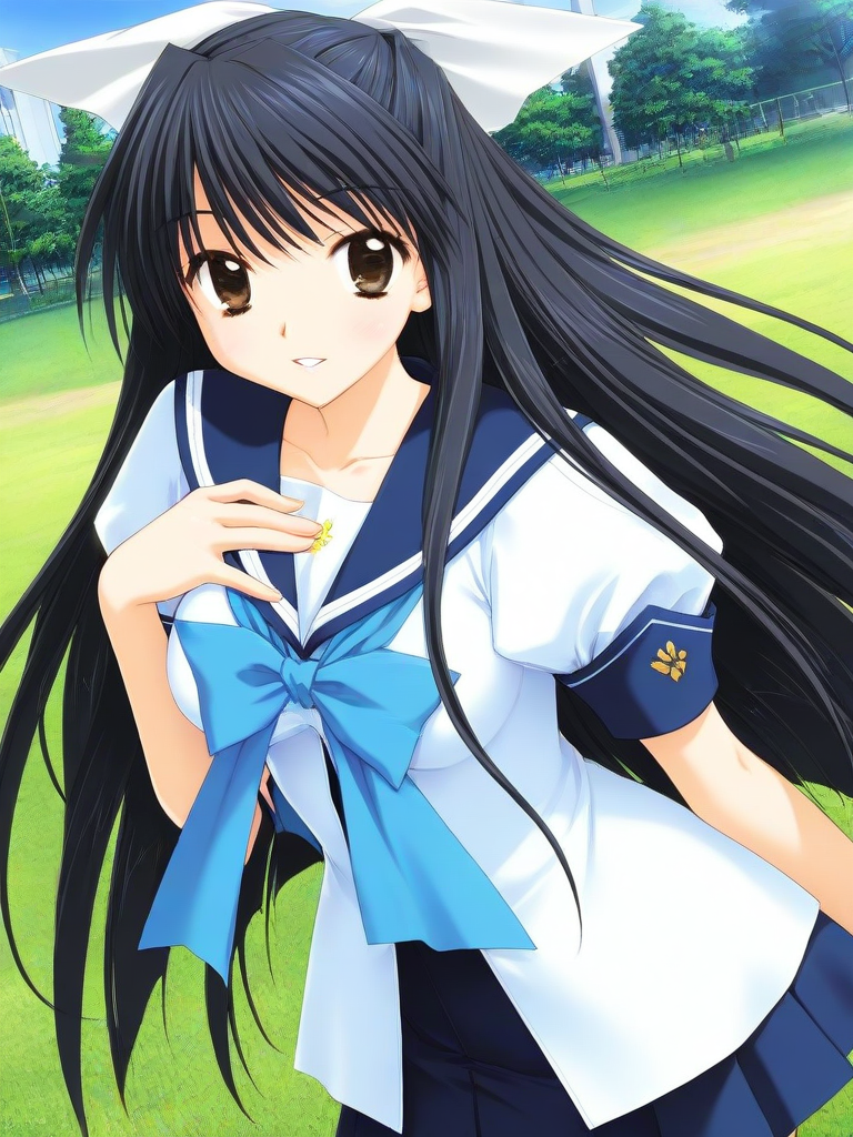 Hatsushiba_Riko, 1girl, solo, black hair, very long hair, brown eyes, breasts, hair white_ribbon,