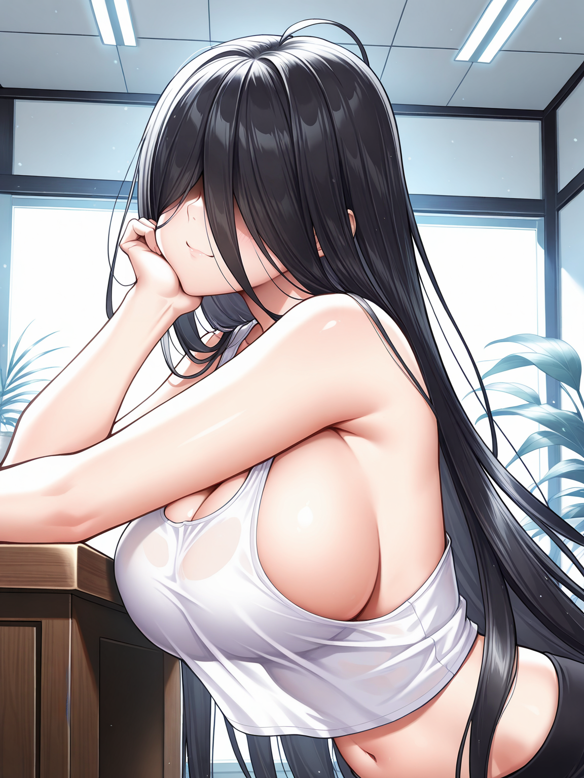 외모2: tmnyahiro, 매우 긴 머리, 검은 머리, 눈 위의 머리카락, 큰 가슴, 높은 폰테일, 접힌 폰테일, 머리핀