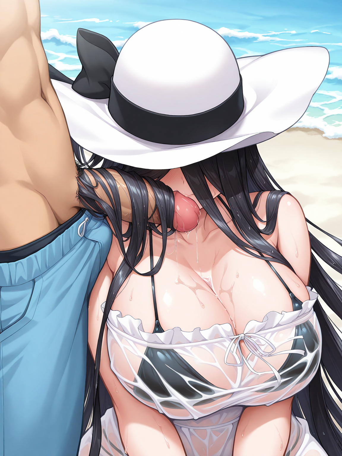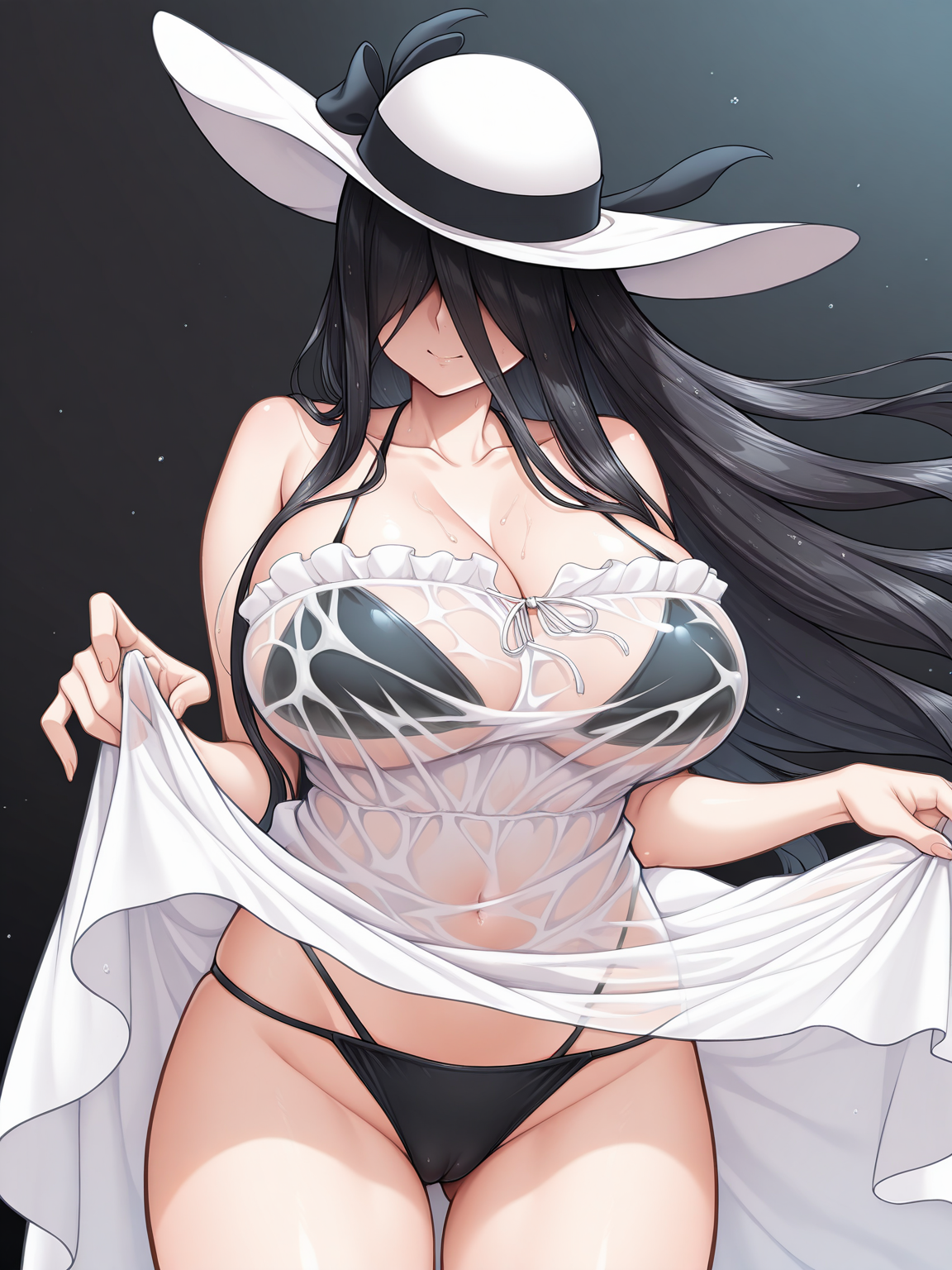 夏日 드레스: 흰색 모자, 흰색夏日 드레스, 스트랩리스夏日 드레스, 프릴, 투명, 검은 비키니, 옷 아래 비키니