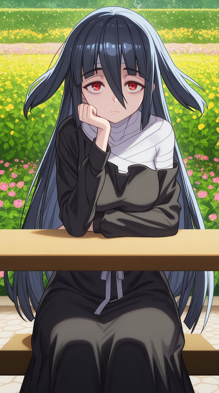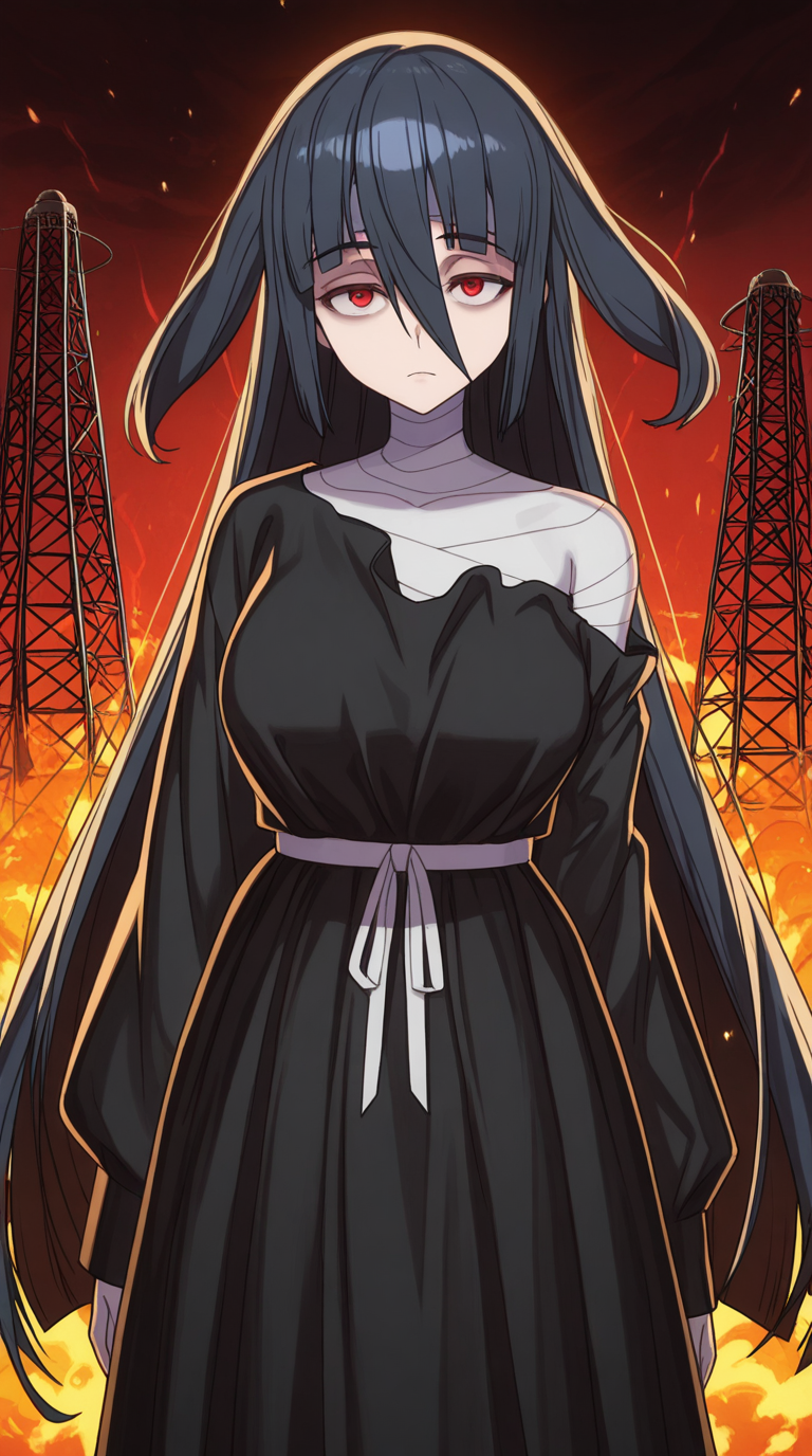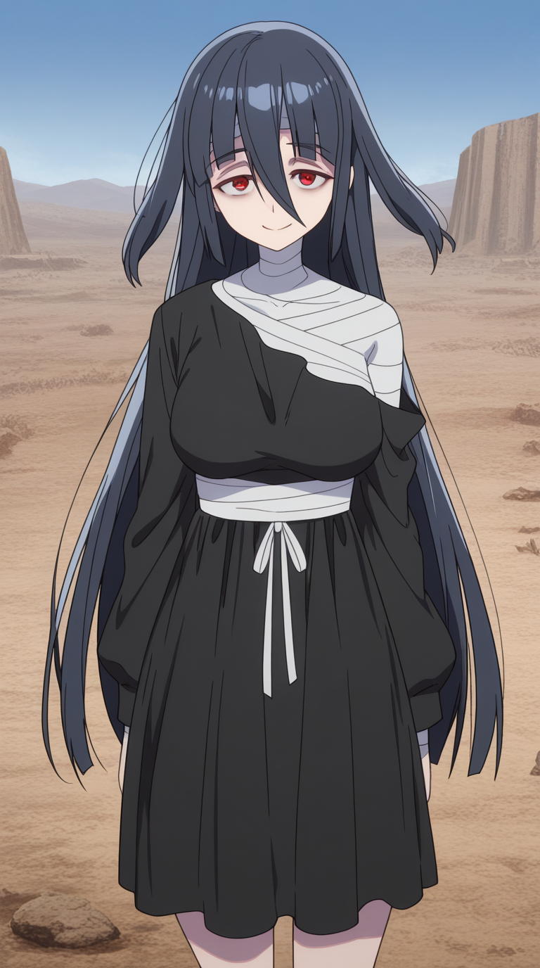 붕대 감은 가슴, 붕대 감은 머리, 붕대, 검은 드레스, 드레스, 어깨 노출