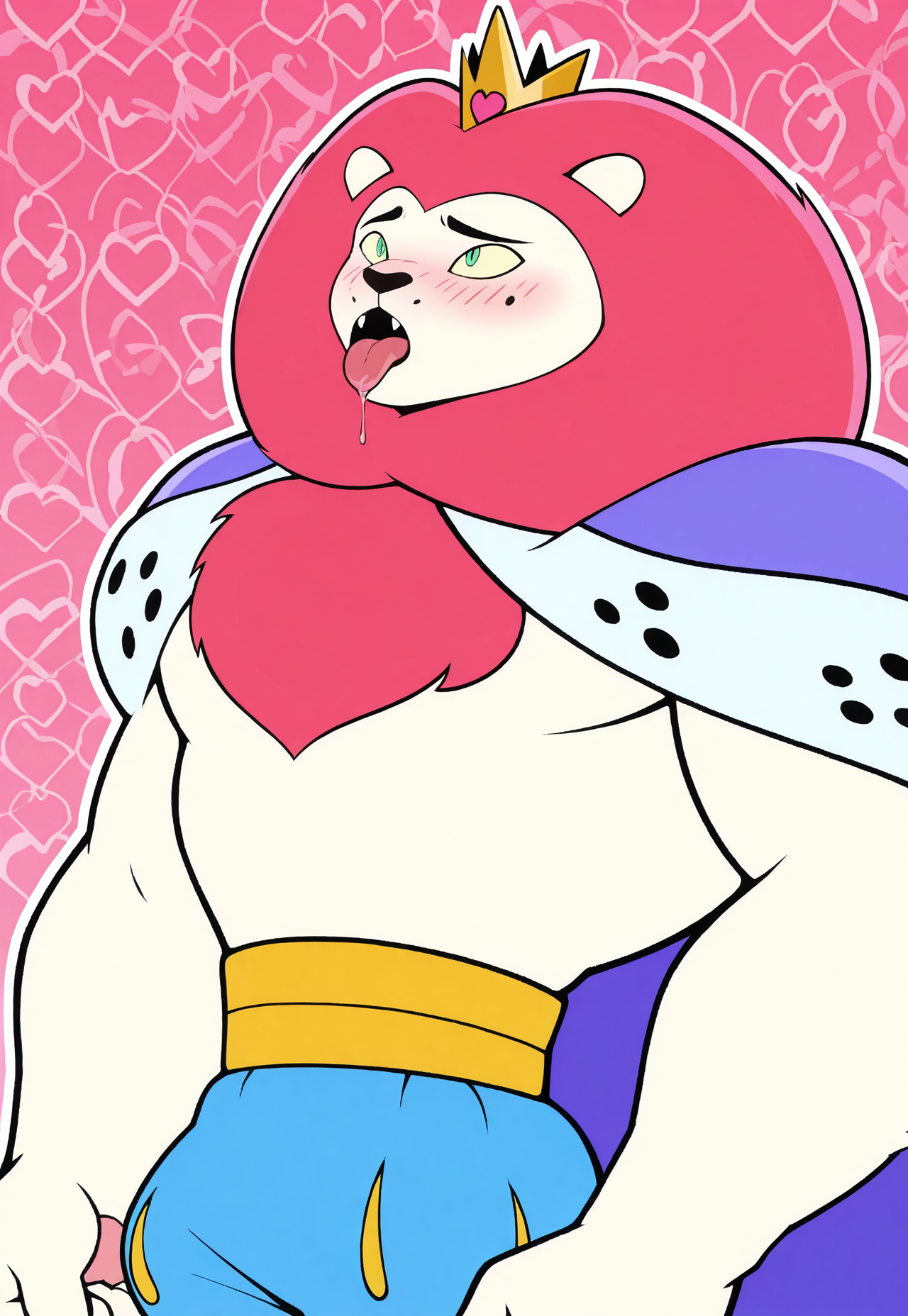 gold crown, small crown, heart-shaped jewel on crown, royal cape, purple cape, white fur trim cape, black spots fur trim, blue puffy shorts, yellow accents, yellow waistband,