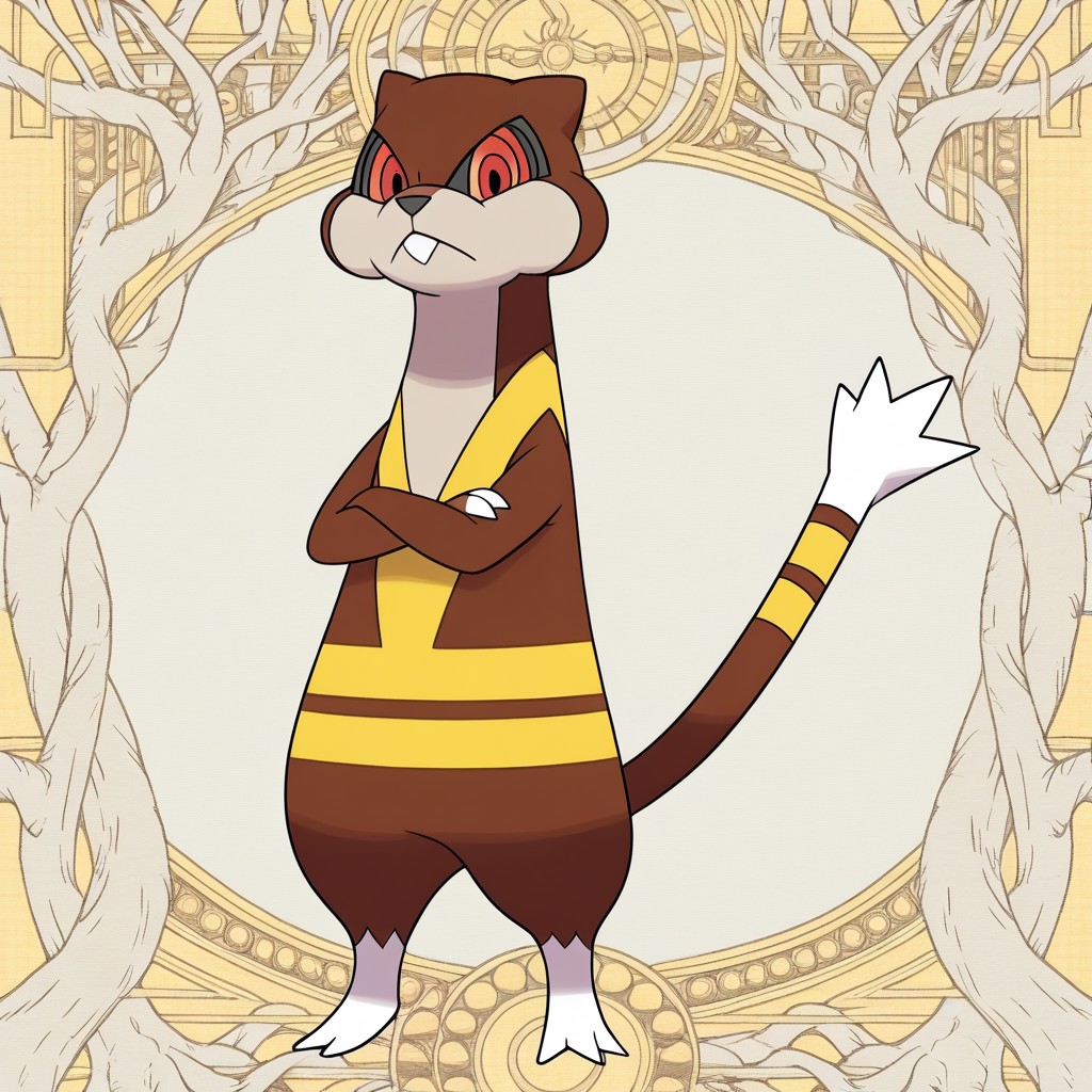 pokemon (creature), rodent, meerkat, brown and yellow fur, red eyes, black nose, tan snout, bucktooth, white hands, white feet, striped tail, white tail tip,