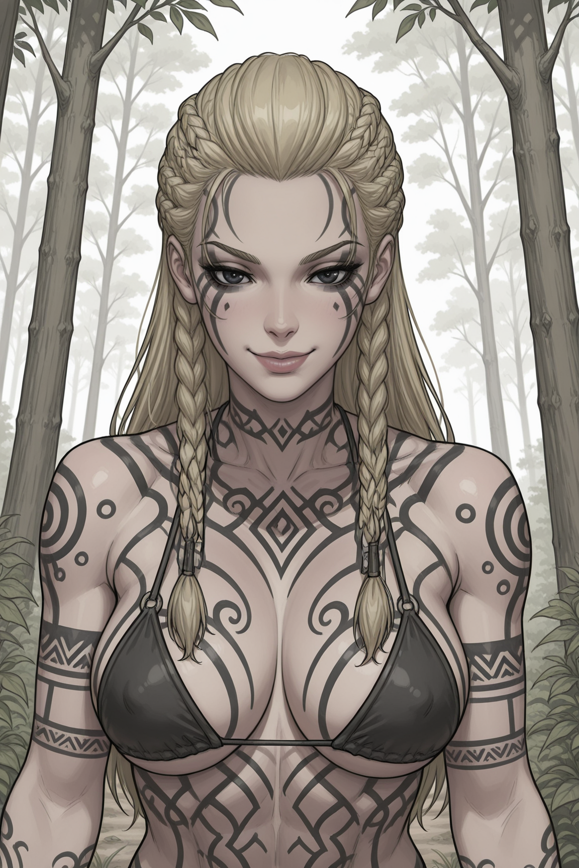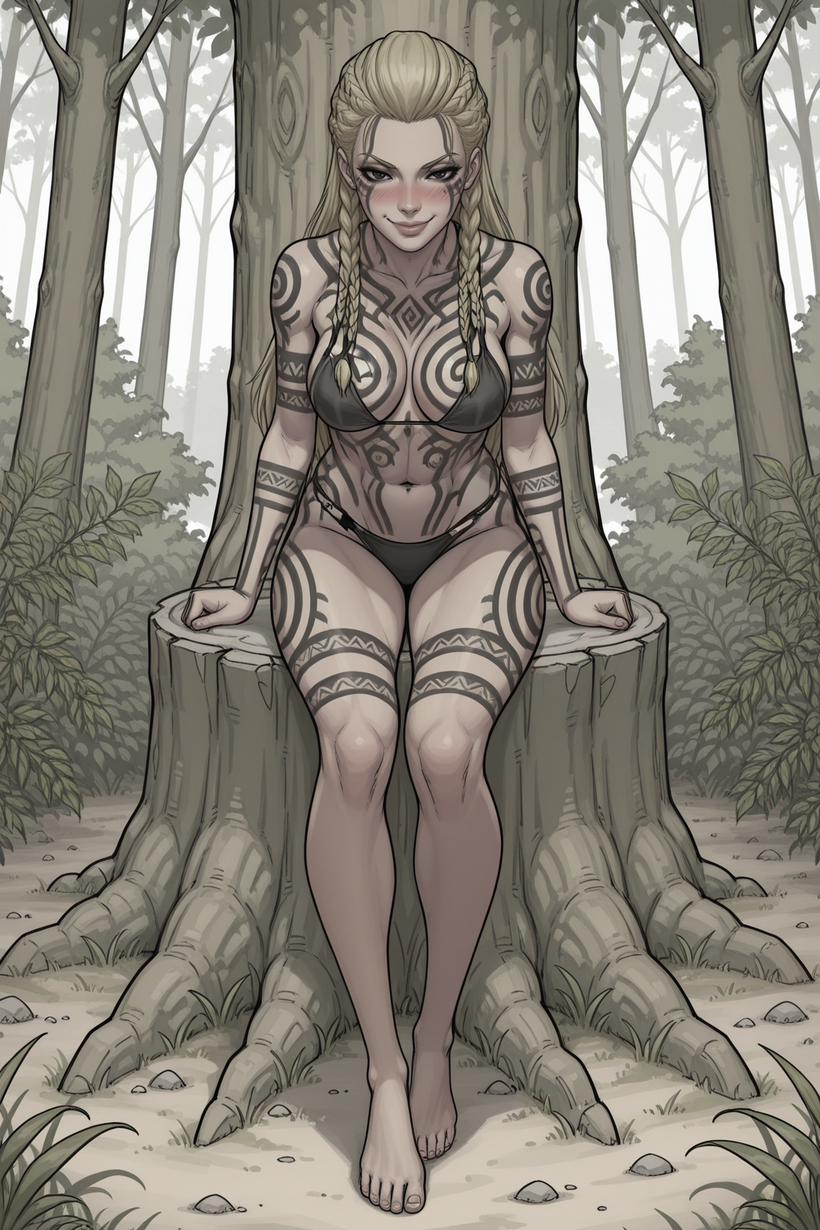 ➜ BorjKILXL, 顔のマーク, 黒い目, 金髪, 長髪, 二つ編み, 全身タトゥー, 大きな胸, 裸足