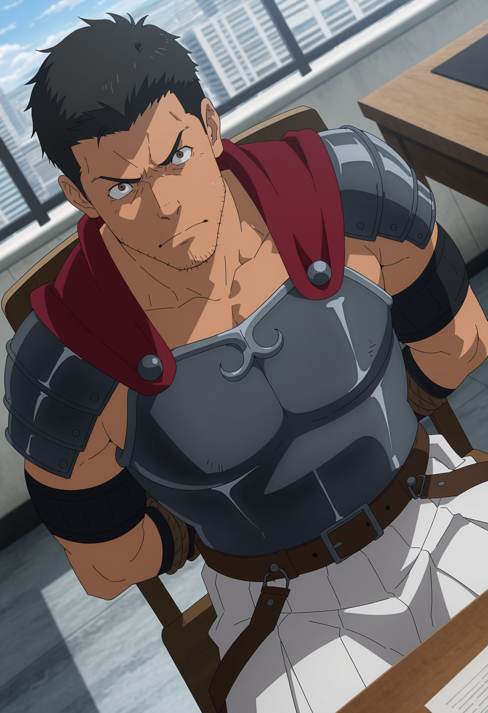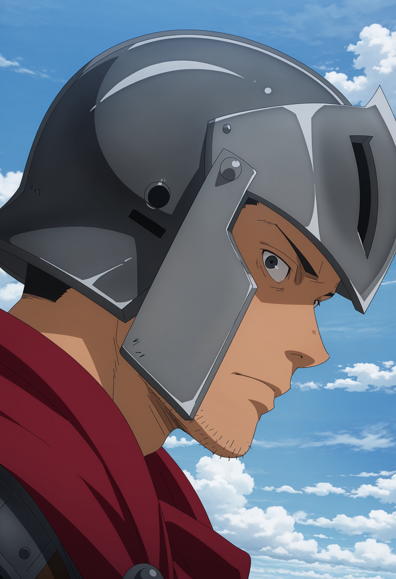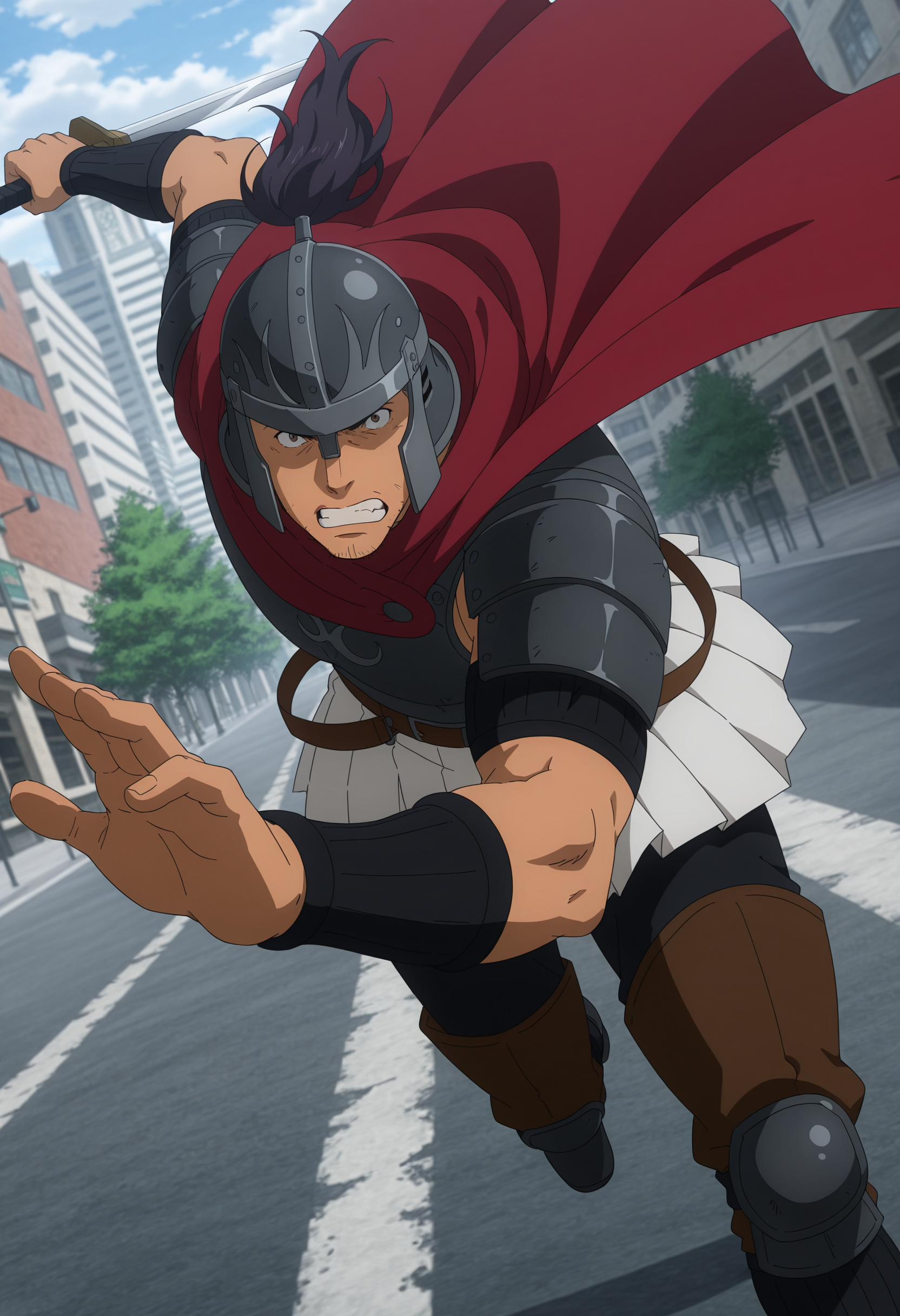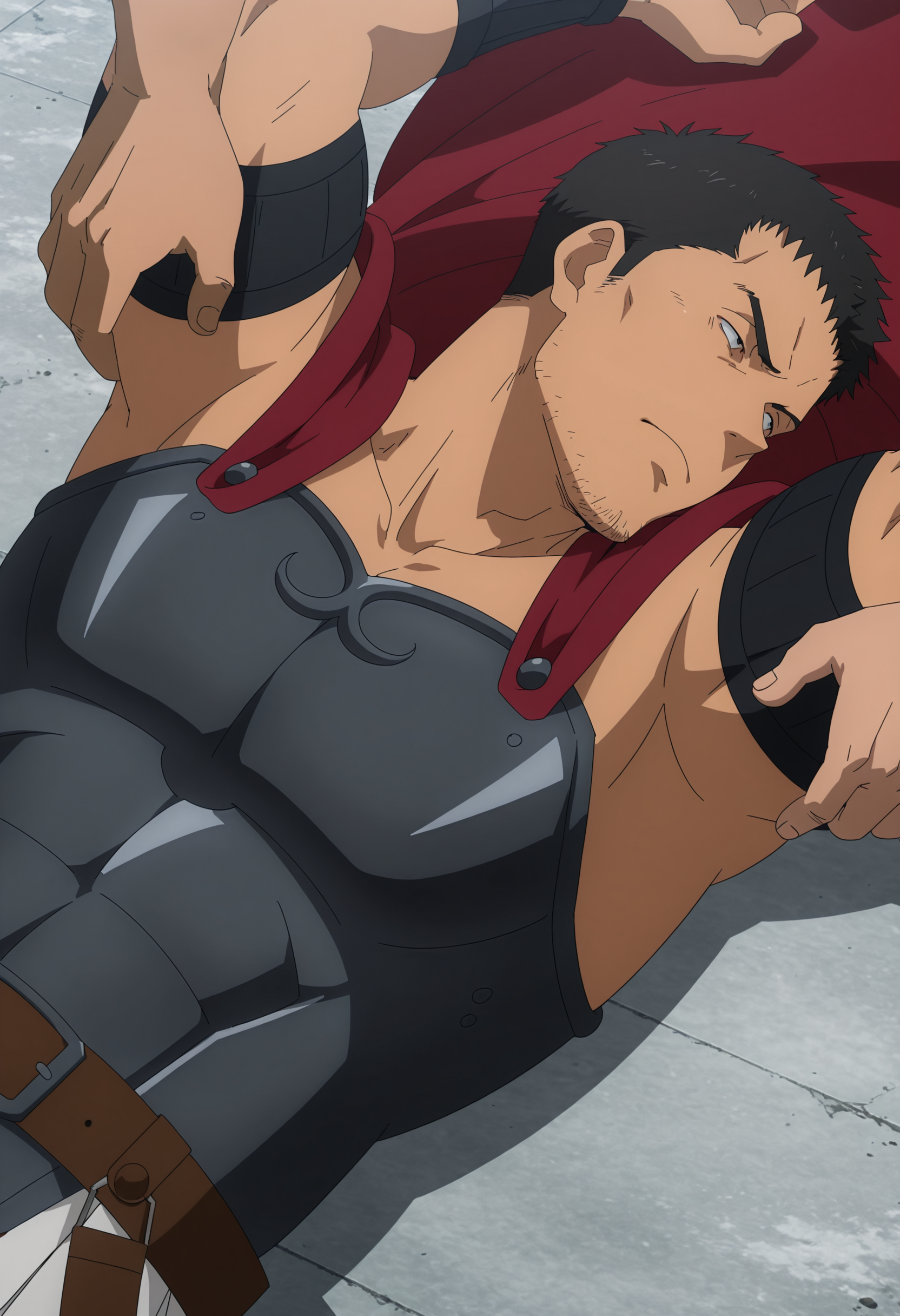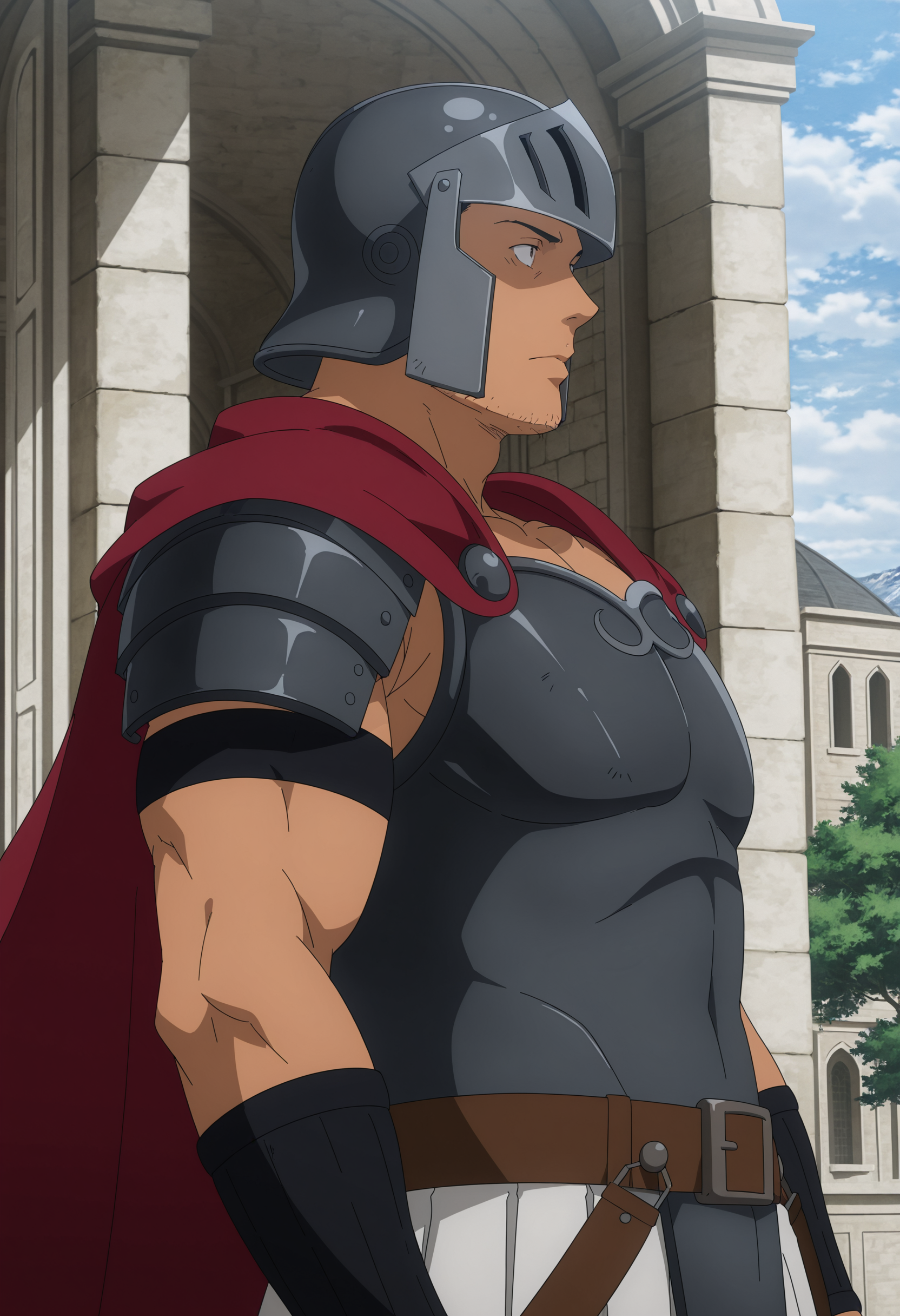helmet, very short hair, black hair, stubble on chin, red cape, black armbands, armored chest plate with metal accents, white pleated skirt, brown belt, black arm guards, brown pants