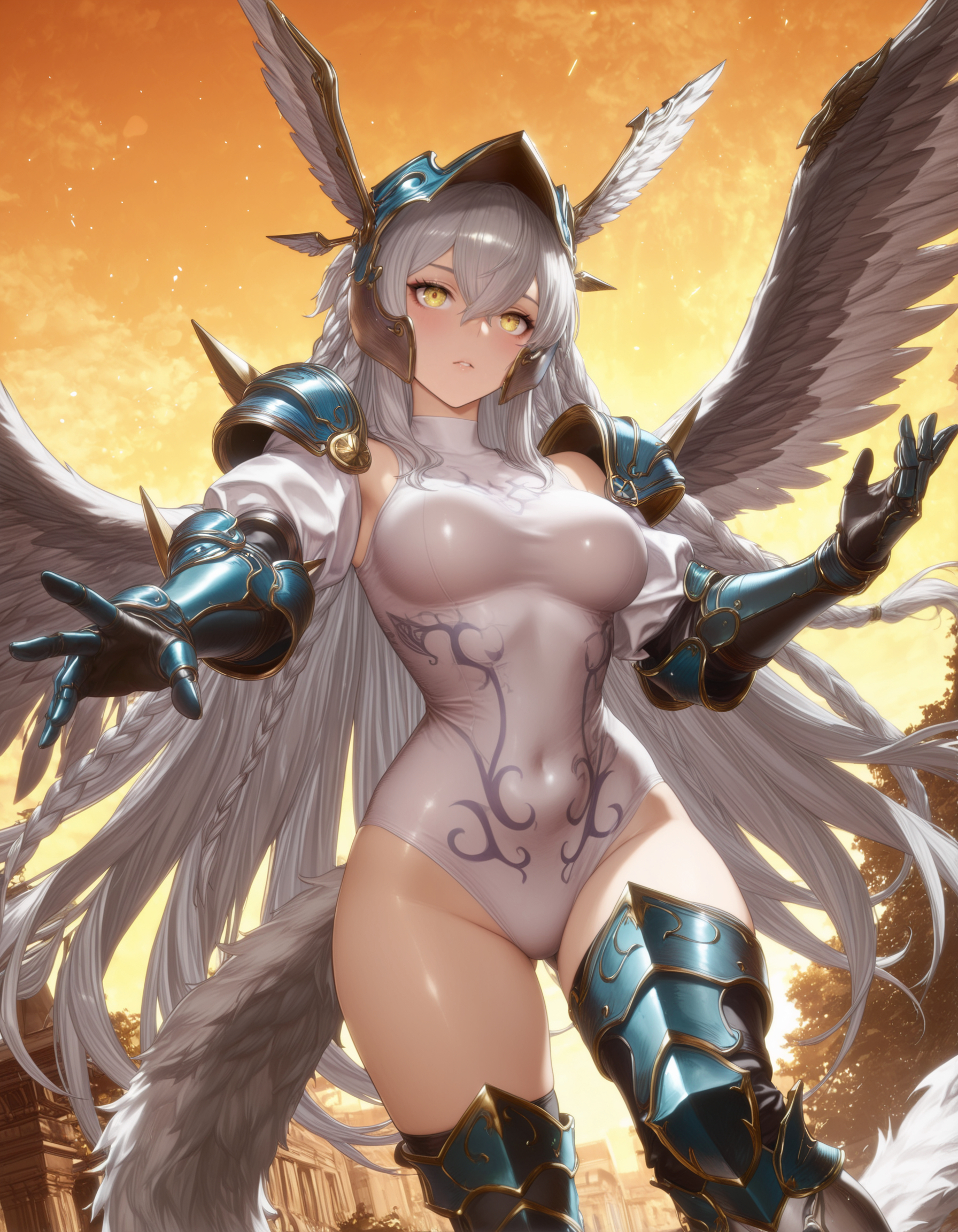 granhildr-def, 큰 가슴, 노란 눈, 회색 머리, 매우 긴 머리, 두 개의 땋은 머리, 발키리 콘셉트, 날개 달린 헬멧, 어깨 보호대, 장갑, 흰색 소매 없는 레오타드, 갑옷이 달린 허벅지까지 긴 부츠,