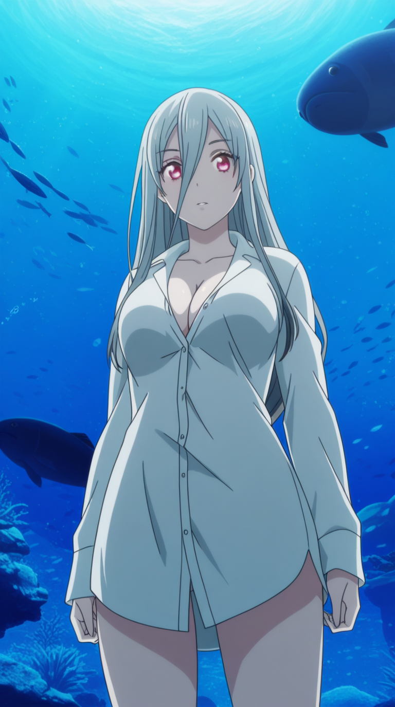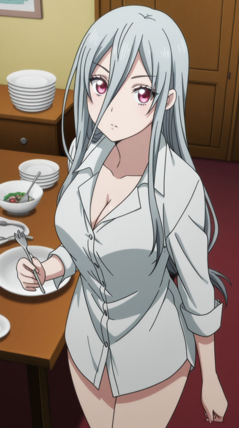 레오나 미야무라, 긴 머리, 분홍색 눈, 회색 머리, 눈 사이의 머리, 성숙한 여성, 중간 크기의 가슴, 애니메이션 스크린캡