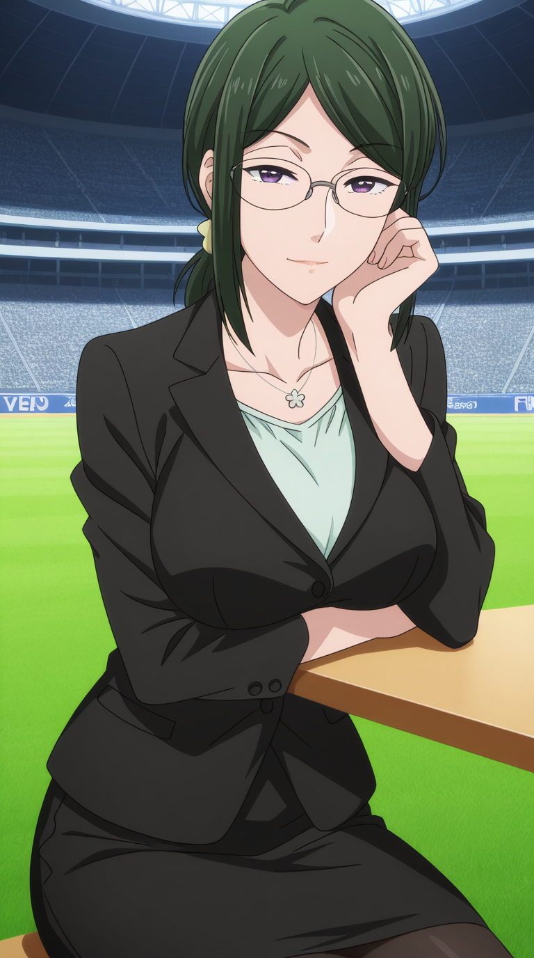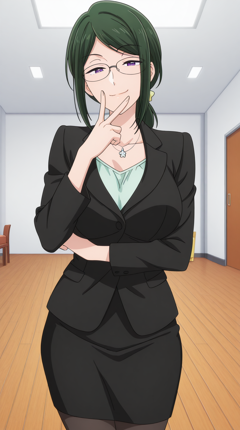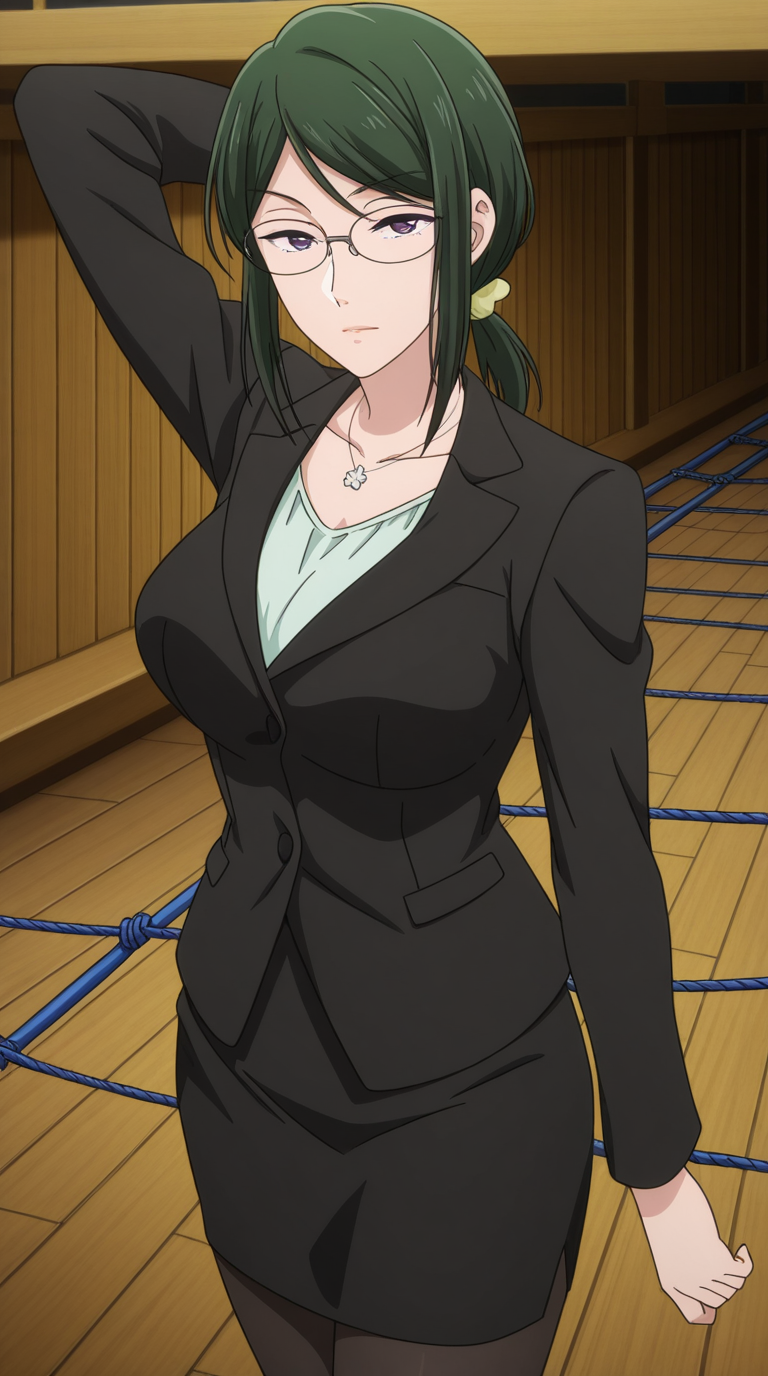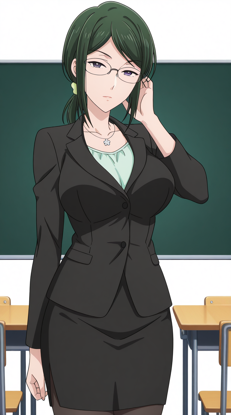 하나코 코야나기, 녹색 머리카락, 낮은 팔찌머리, 보라색 눈, 안경, 성숙한 여성, 큰 가슴, 애니메이션 스크린캡