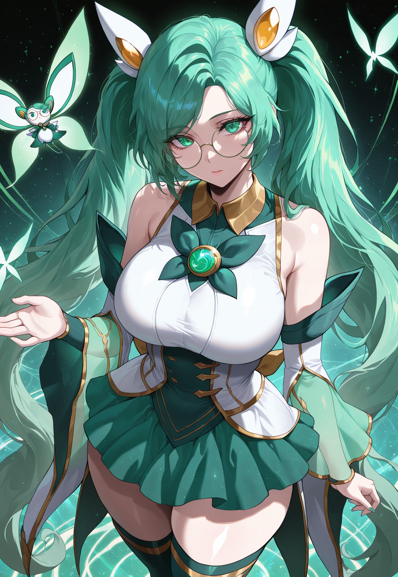 SGsona,green hair,very long hair,twintails,hair ornament,green eyes,round eyewear,large breasts,wide sleeves,multicolored dress,magical girl,thighhighs,skirt,