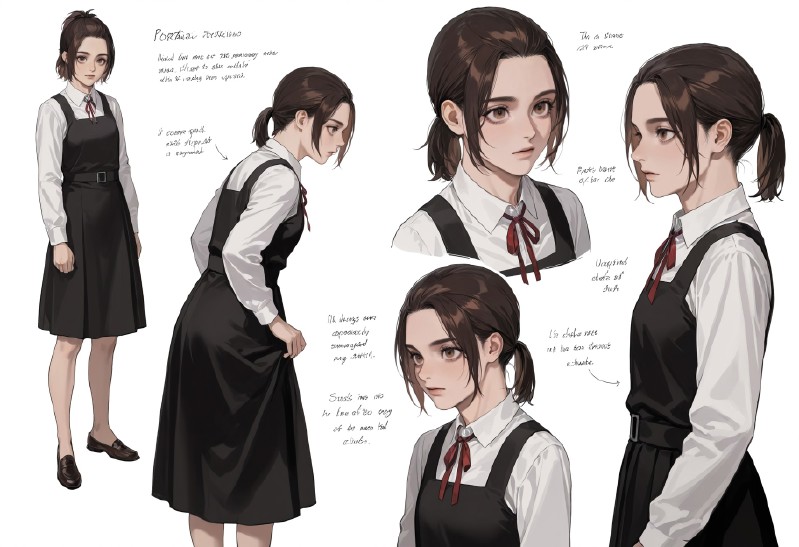 짧은 머리, 플랫테일, 드레스, 학교 유니폼, 리본, 앞치마 드레스, 구두, 검은 드레스, 셔츠, 긴 소매, 빨간 리본, 목 리본, 흰 셔츠