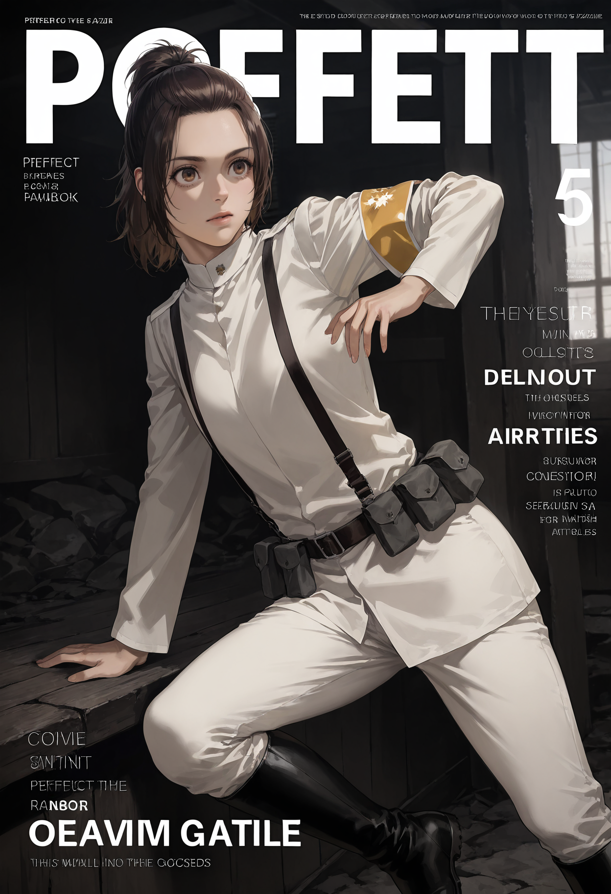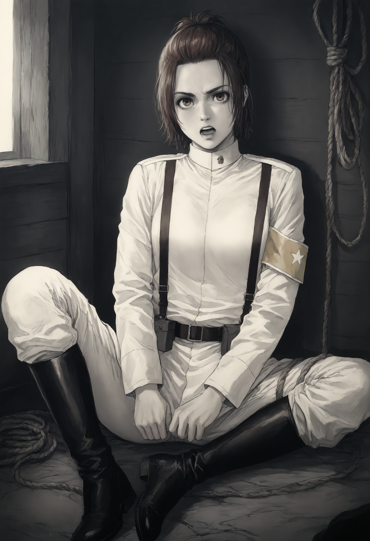 플랫테일, 군복, 유니폼, 군사, 재킷, 긴 소매, 팔찌, 벨트, 스스펜더, 파우치, 바지, 흰 바지, 부츠, 무릎 부츠, 검은 신발