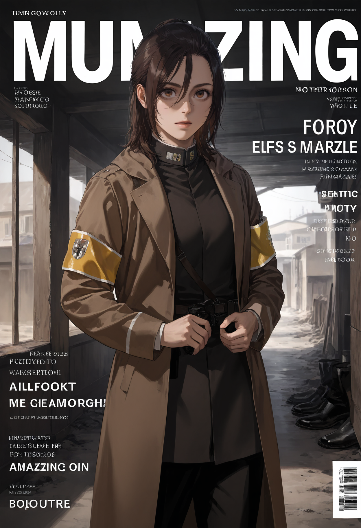 앞머리, 중간 길이 머리, 긴 머리, 눈 사이 머리, 팔찌, 코트, 긴 소매, 검은 신발, 갈색 코트, 구두, 유니폼, 군사, 군복, 재킷, 바지, 검은 코트