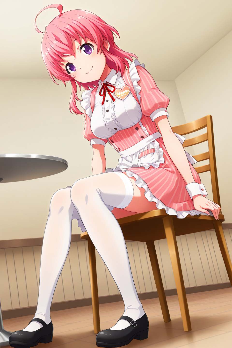 cream and butter uniform, maid, waitress, short dress, vertical striped dress, frilled dress, pink dress, collared dress, white collar, red neck ribbon, puffy short sleeves, white wrist cuffs, waist apron, white apron, frilled apron, zettai ryouiki, white thighhighs, see through thighhighs, black shoes, mary janes, name tag,