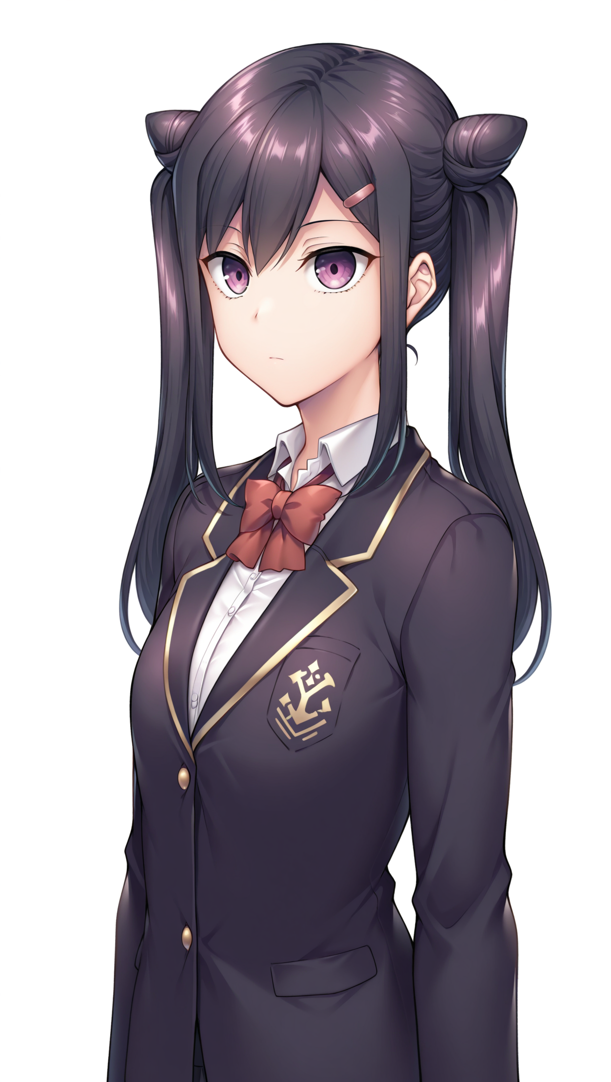 일반 외모: 긴 머리, 양쪽 올려매기, 검은 머리, 보라색 눈, 헤어클립, 작은 가슴