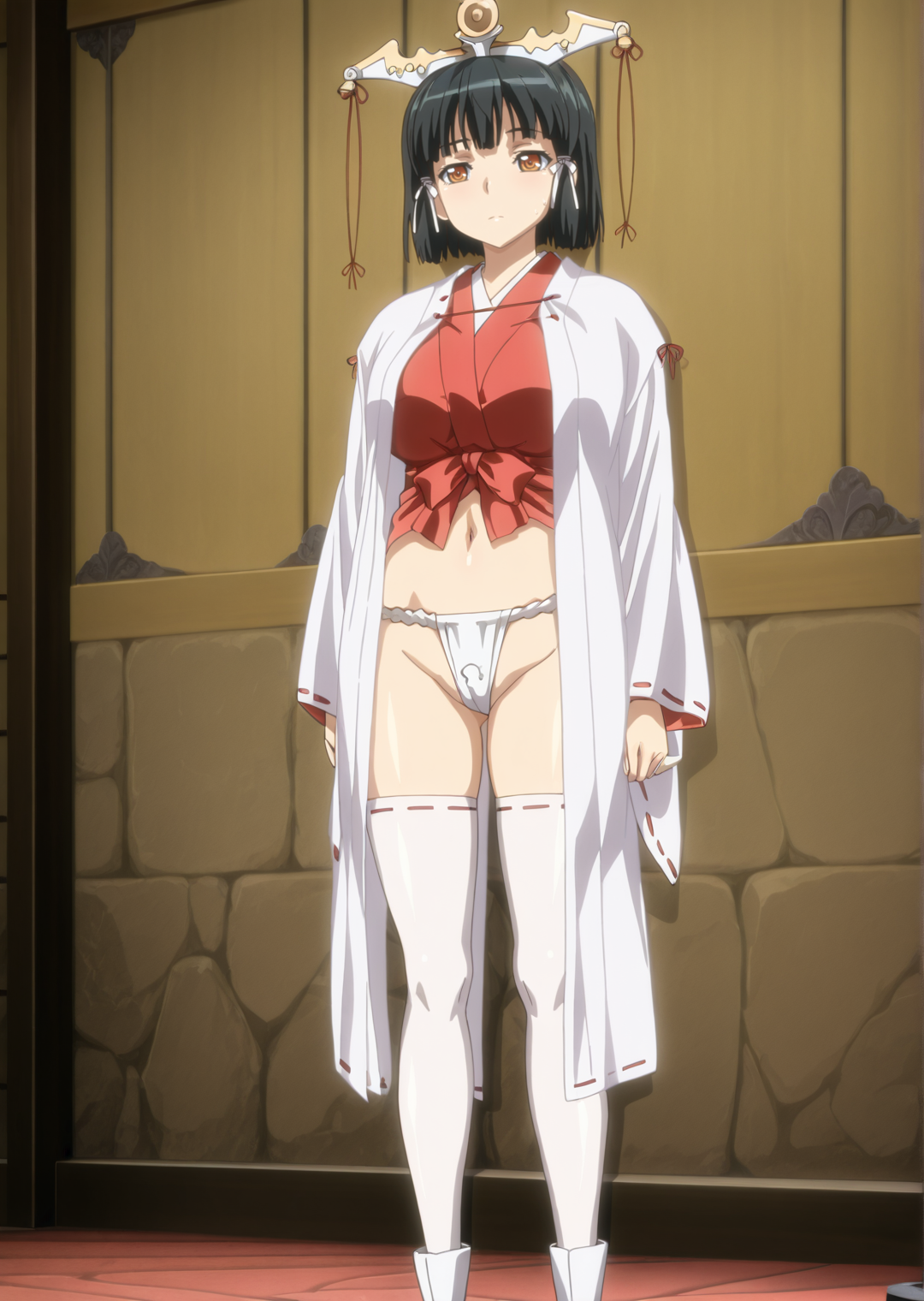 navel, japanese clothes, fundoshi, white thighhighs, ribbon-trimmed legwear, miko, headdress, tabi, sandals, white socks