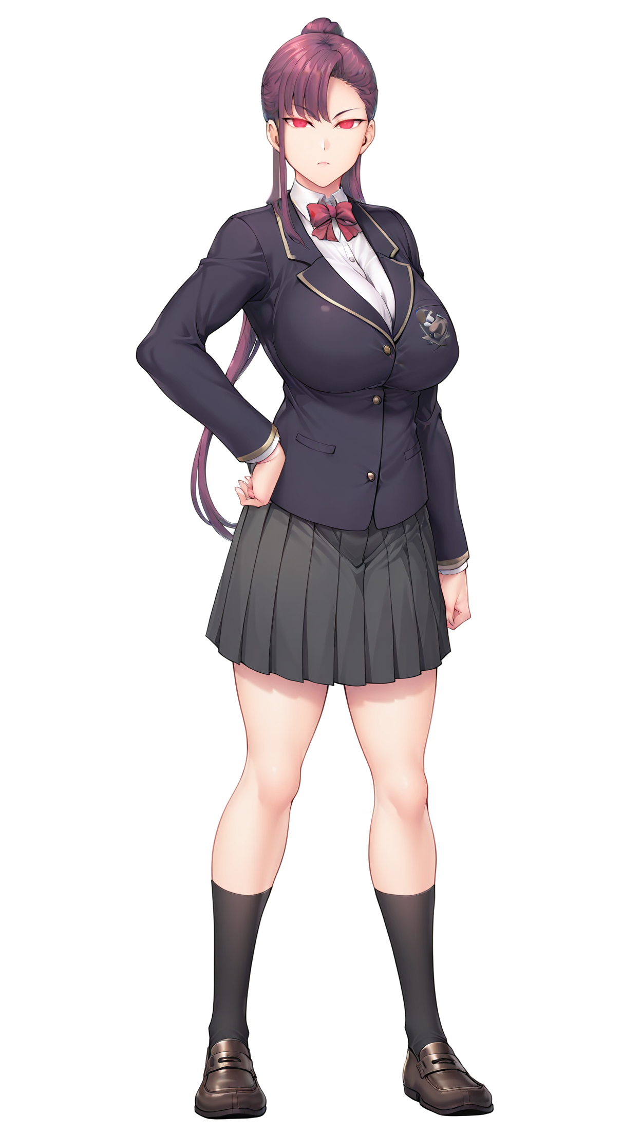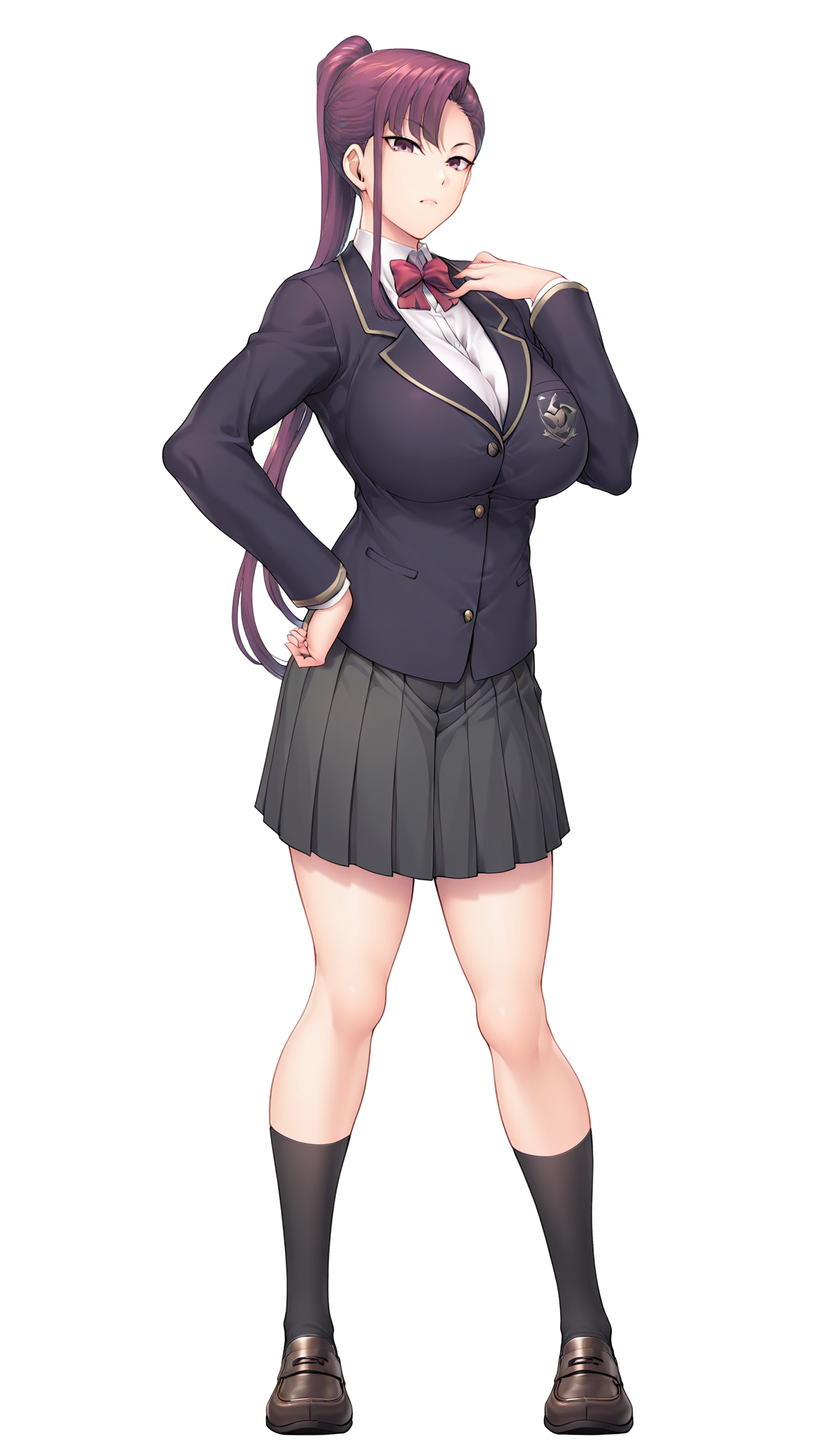 学校制服: 学校制服, シャツ, 白いシャツ, ポロシャツ, ボウタイ, 胸, ブレザー, 紫のブレザー, 長袖, スカート, 灰色のスカート, プリーツスカート, ソックス, 黒いソックス, 靴, 茶色の靴