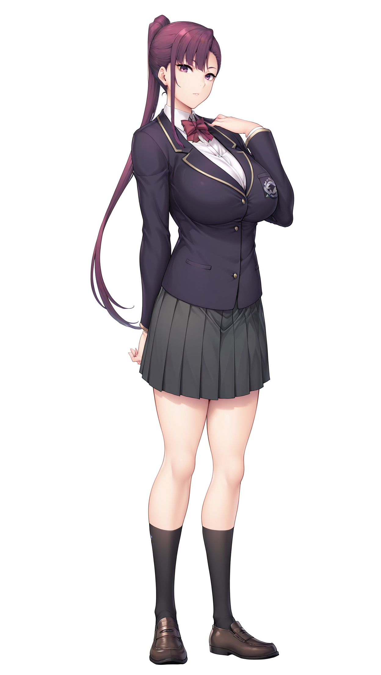 h1mur04y4, 1girl, long hair, ponytail, purple hair, purple eyes, school uniform, shirt, white shirt, collared shirt, bowtie, large breasts, blazer, purple blazer, long sleeves, skirt, grey skirt, pleated skirt, socks, black socks, shoes, brown footwear