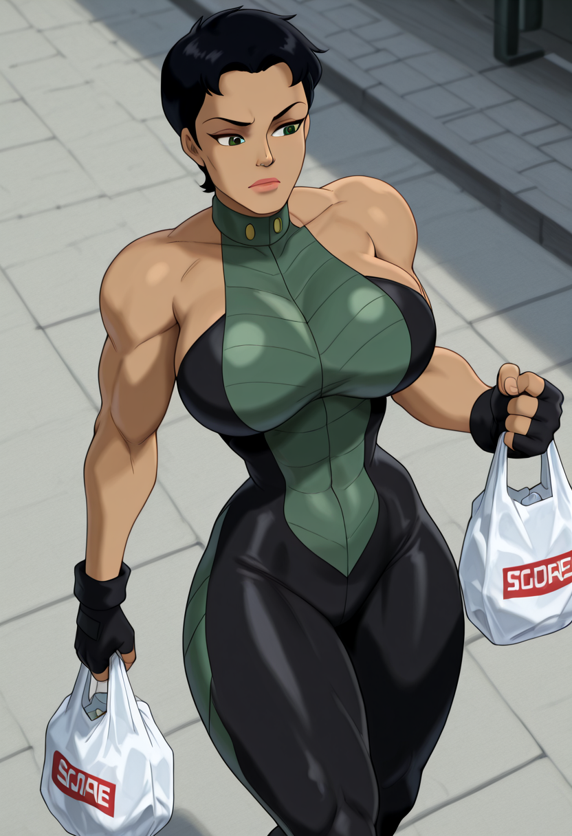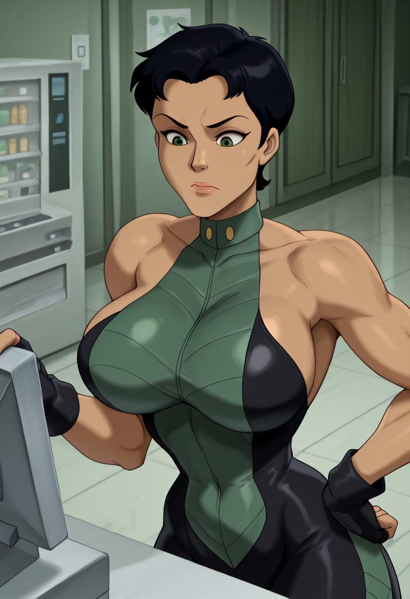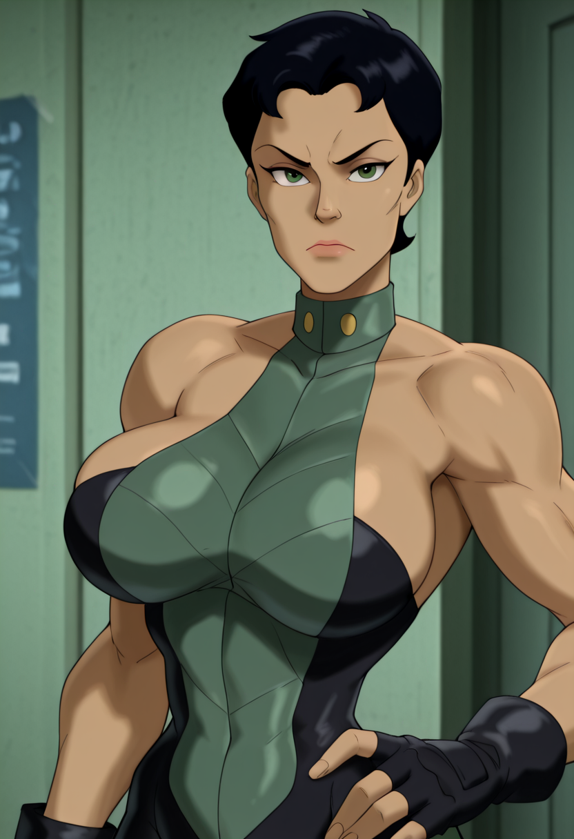 green turtleneck, bare shoulders, black bodysuit, black gloves, green trim, green leotard, fingerless gloves,
