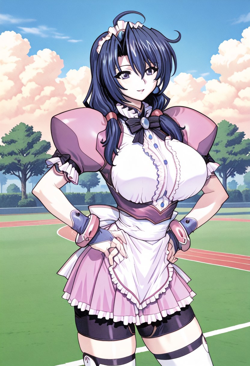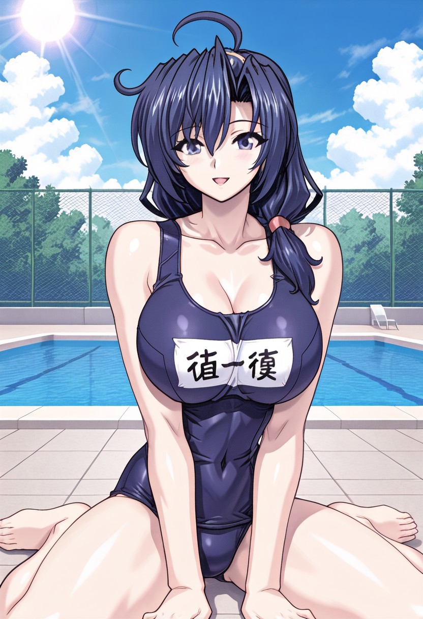 青い目、長い髪、アホ毛、青い髪、髪飾り、大きな胸、