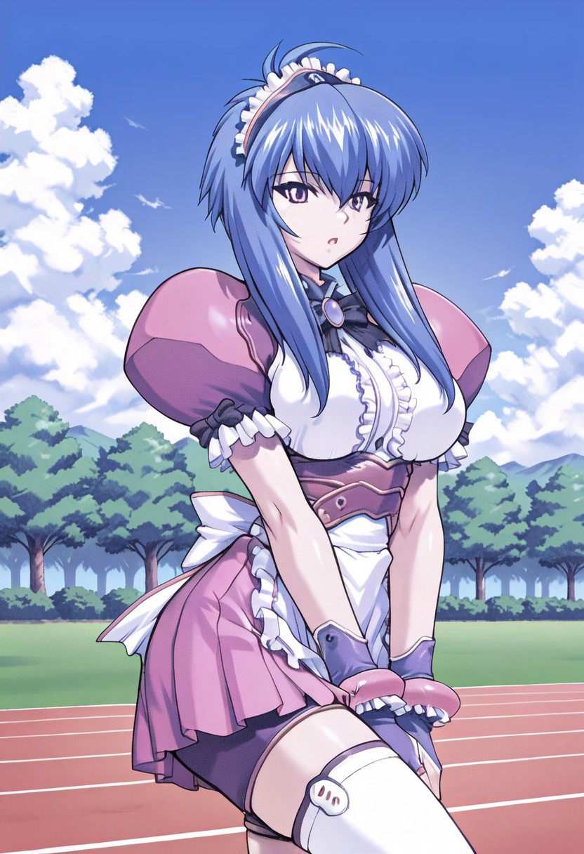 ドレス、フリル、メイド、ふわふわの短い袖、メイド頭飾り、ブライダルガントレット、黒いリボン、ブローチ、ピンクのスカート、エプロン、自転車用ショート、絶対領域、タイツ、スニーカー、