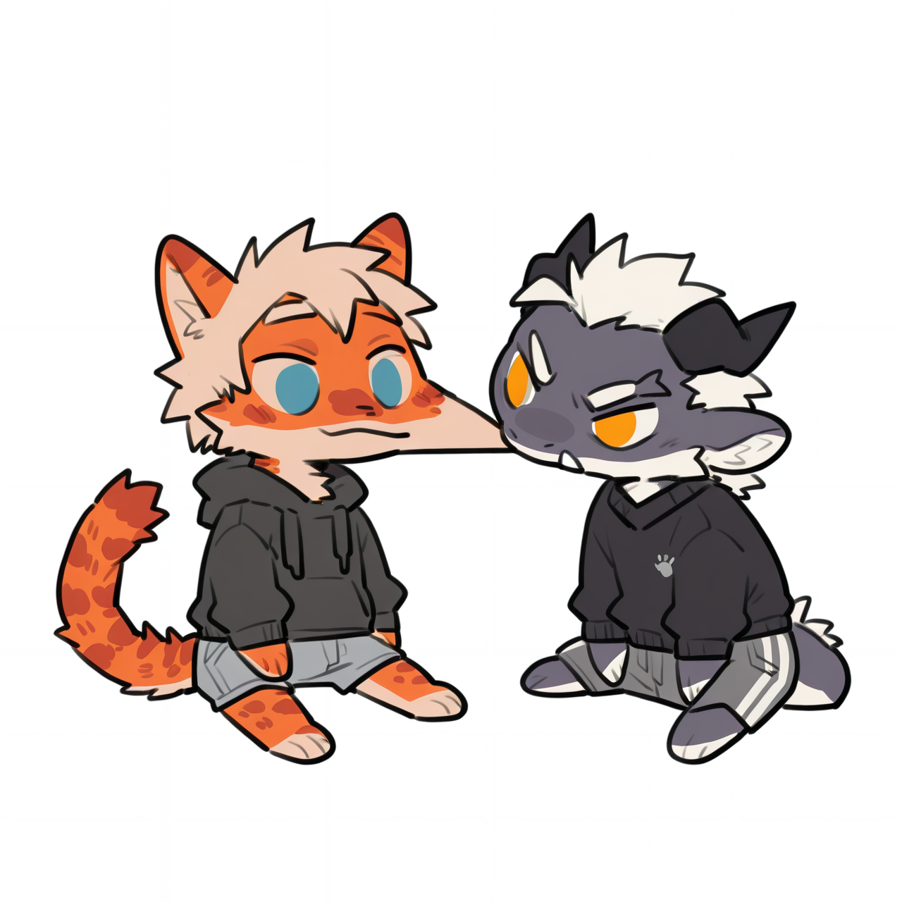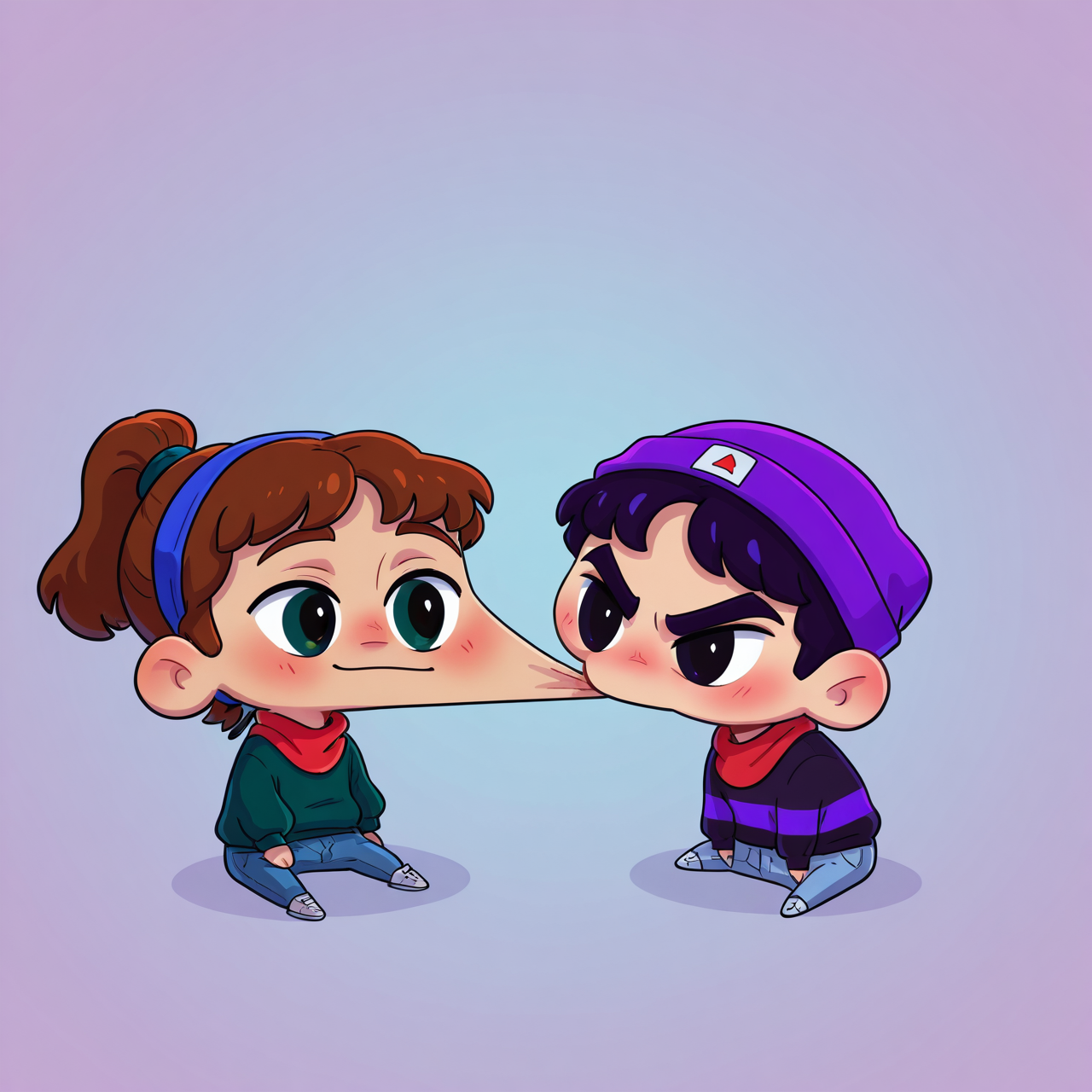 mikus-concept, duo, chibi, face stretch, pulling cheek, facing each other, sitting, close-up, full body, simple background
