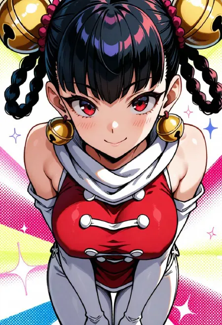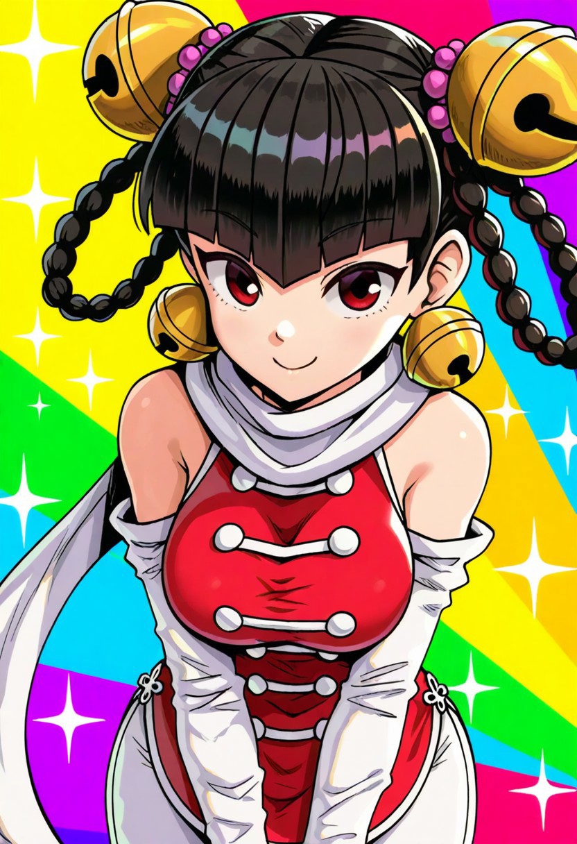 髪の鈴、ジャンクルベル、ジャンクルベルのイヤリング、白いスカーフ、中国服、チャイナドレス、ノースリーブドレス、短いドレス、赤いドレス、取り外し可能な袖、手首より長い袖、白いズボン、カプリパンツ、足首の鈴、フラットシューズ、メアリージェーンズ、ツートーンシューズ、赤い靴、白い靴