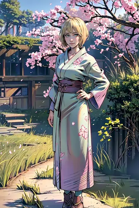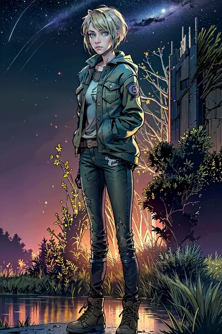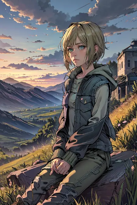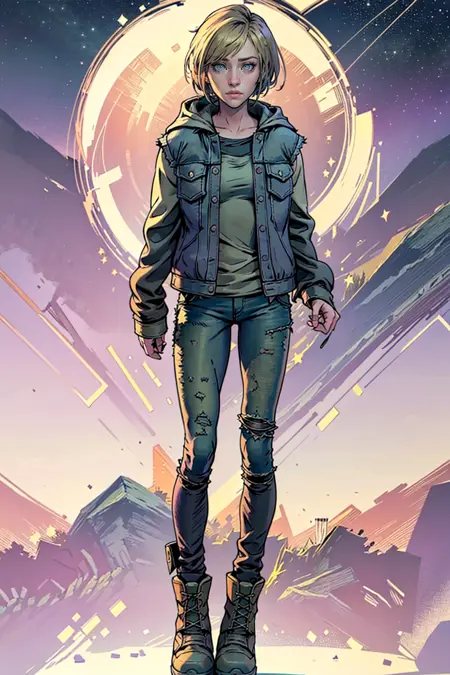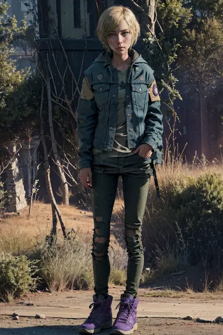 1girl, blonde hair, closed mouth, denim jacket, dirty face, layered sleeves, long sleeves, looking at viewer, brown boots, purple shoe laces, realistic, shirt, short hair, solo, violettwd, green eyes, beautiful eyes, masterpiece, high res, pants lora:VioletV1.1:0.8