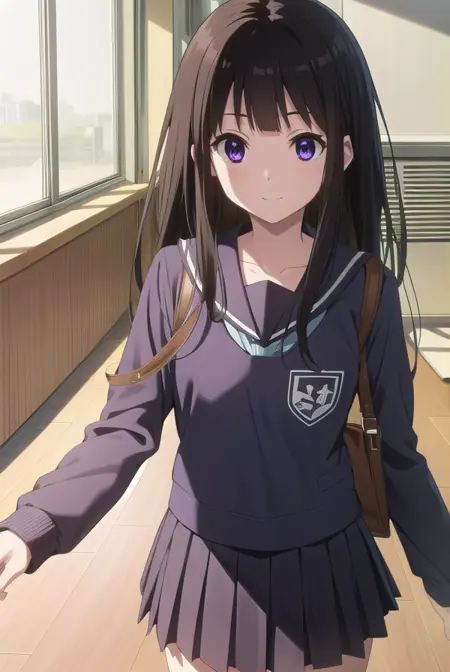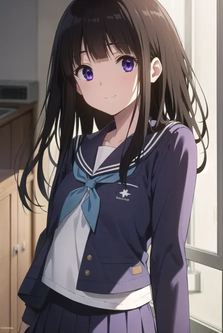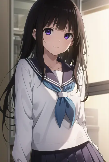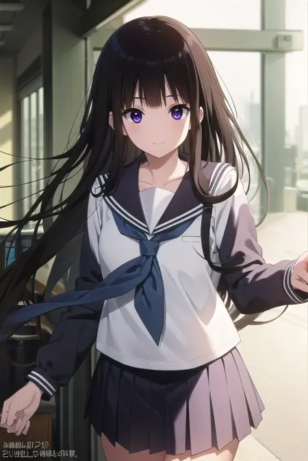 eru chitanda、長い髪、黒髪、前髪、まっすぐな前髪、(紫の目:1.1)、横髪、