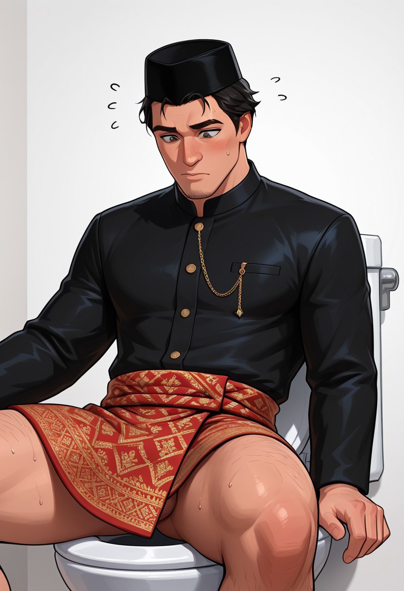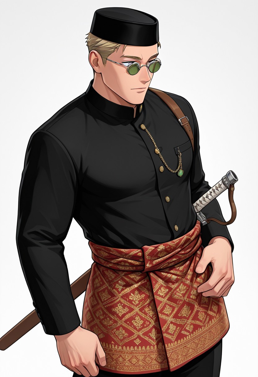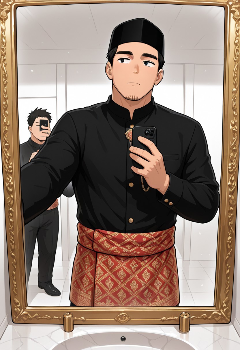 demang (suit), songkok (headwear), black headwear, songket (sash), black shirt, high collar shirt, chain, brooch, black pants,