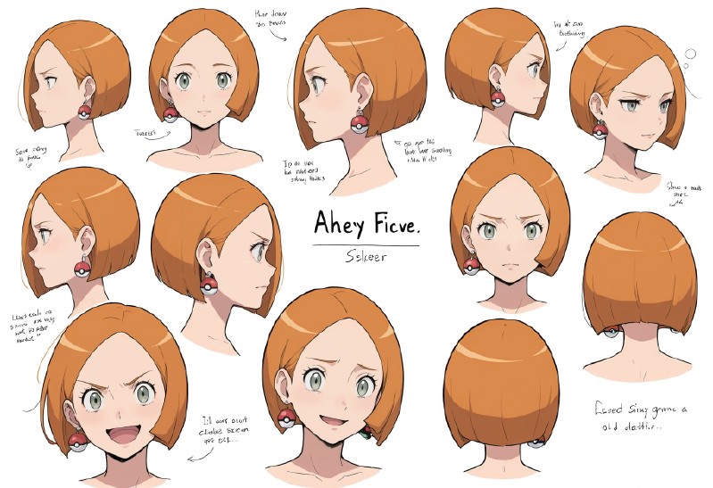 1girl,eyelashes,grey eyes,green eyes,short hair,orange hair,brown hair,bangs,earrings,pokeball theme earrings