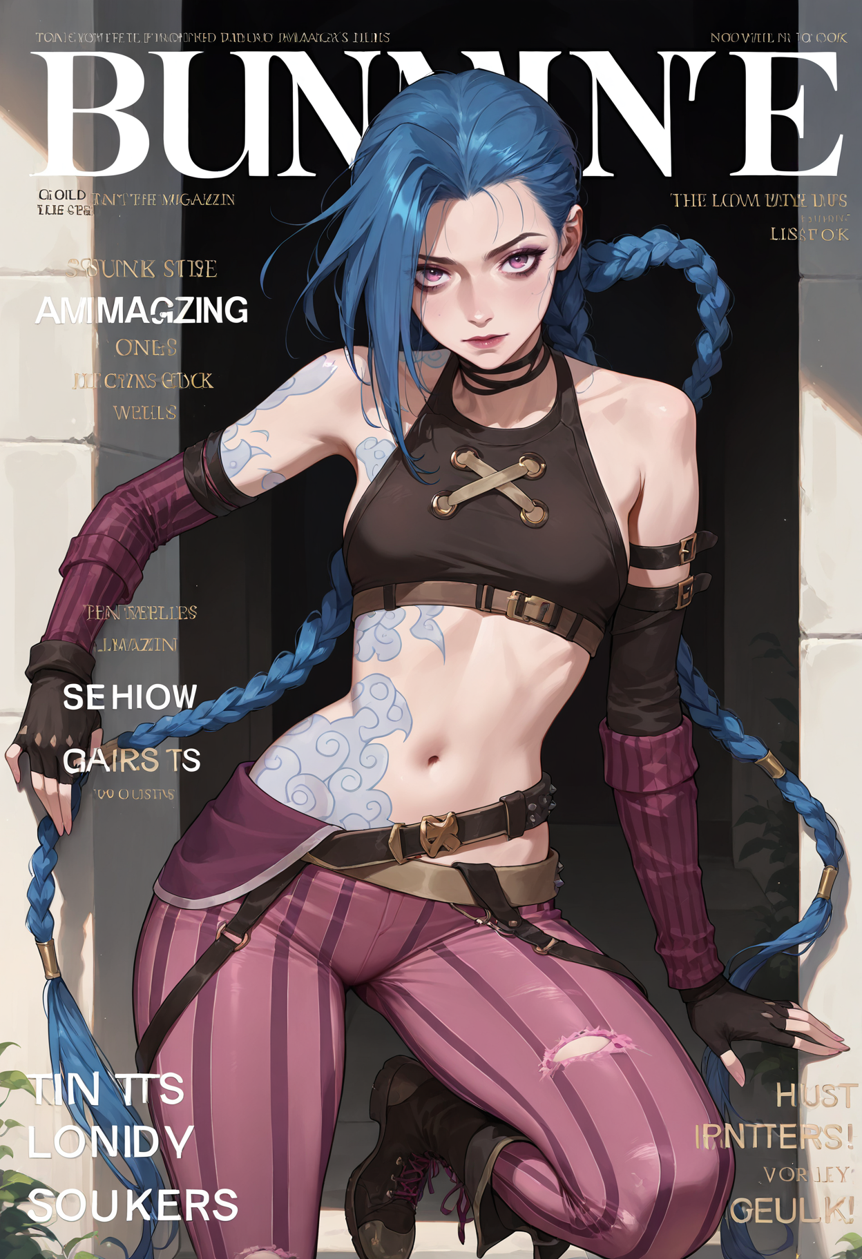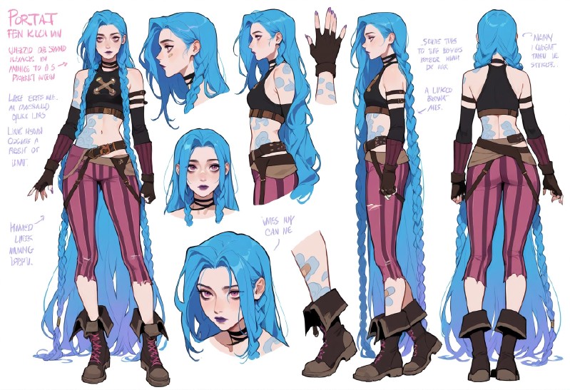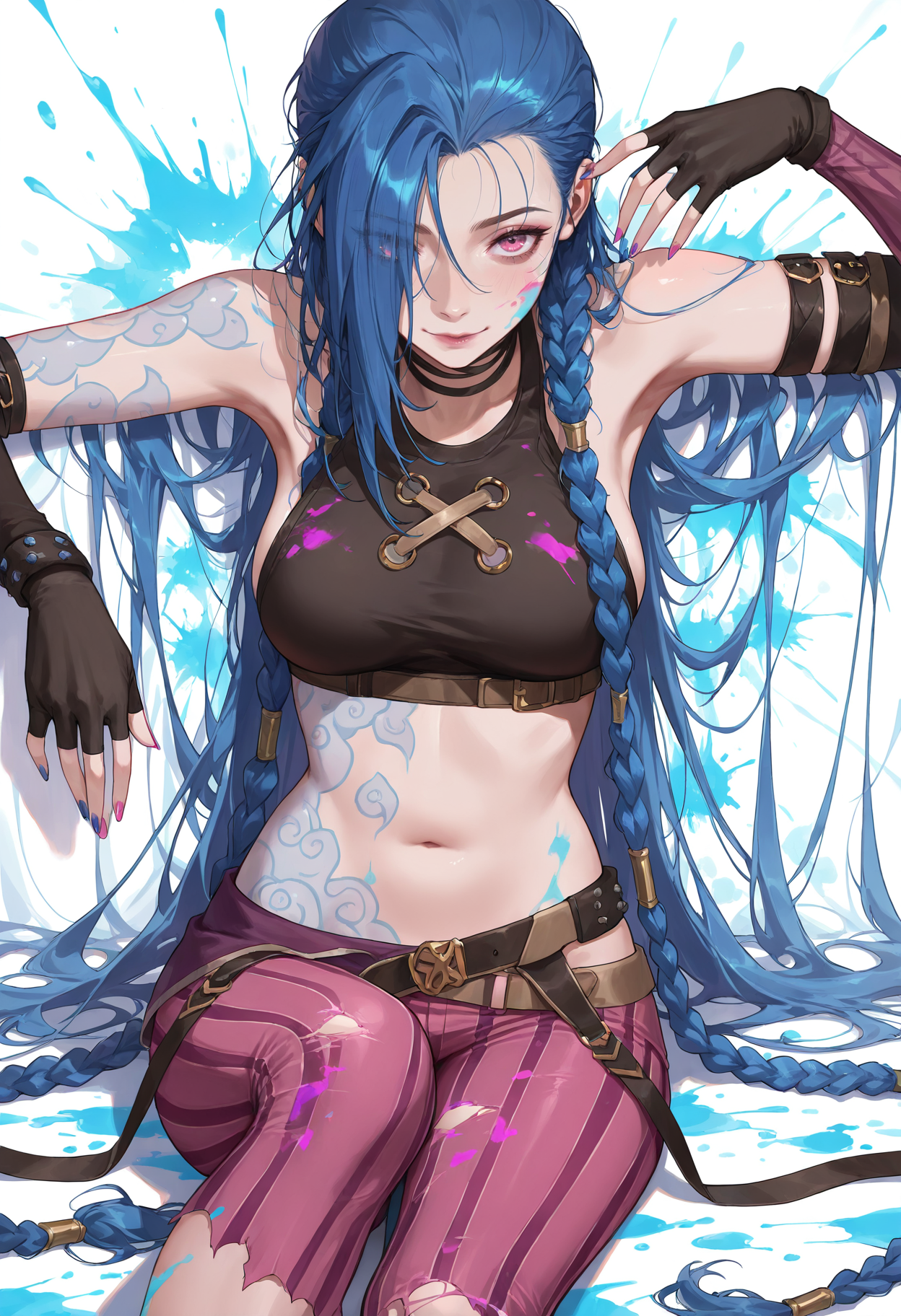 choker,black choker,crop top,shirt,detached sleeves,bare shoulders,striped sleeves,midriff,stomach tattoo,breasts,medium breasts,small breasts,belt,brown belt,fingerless gloves,gloves,black gloves,brown gloves,arm tattoo,shoulder tattoo,tattoo,bandaid,pants,striped pants,pink pants,torn pants,torn clothes,boots,black footwear,brown footwear,shoes