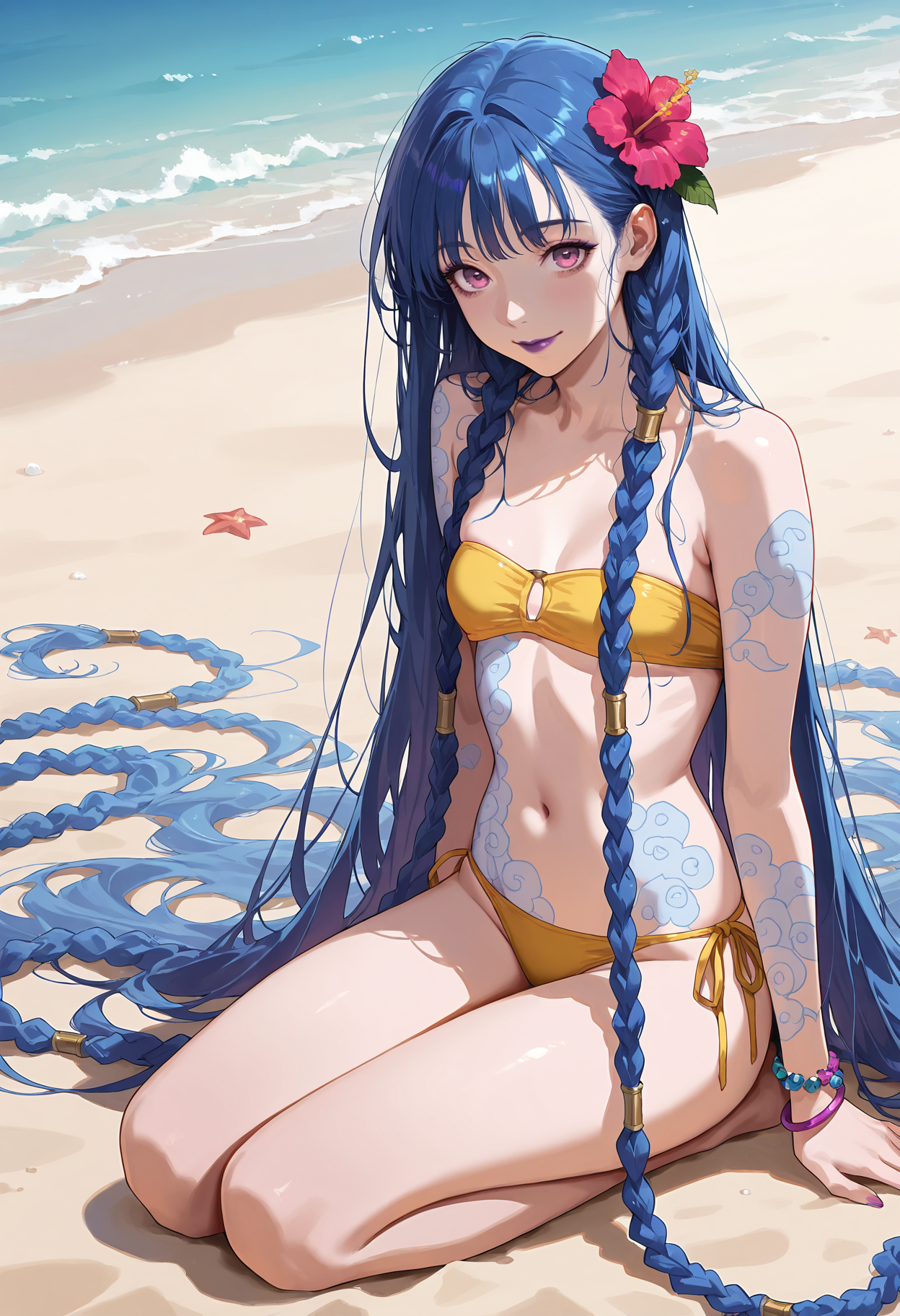 1girl,blue hair,very long hair,long hair,absurdly long hair,hair down,alternate hairstyle,alternate hair length,bangs,braid,twin braids,purple eyes,pink eyes,purple lips,lipstick,makeup