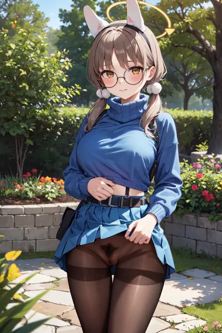- aamoe,halo,fake animal ears,rabbit ears,glasses,round eyewear,long hair,low twintails,pom pom hair ornament,bangs,large breasts,blue sweater,cropped sweater,turtleneck,long sleeves,belt pouch,belt,pouch,(pleated skirt:1.4),two-tone skirt,(brown pantyhose:1.2),boots,black footwear