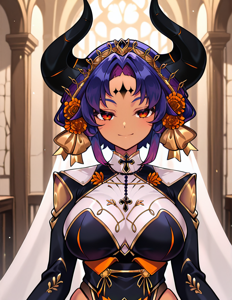 MixteNex, 1소녀, 혼자, 가슴, 단발, 큰 가슴, 머리 장식, 빨간 눈, 파란 머리, 보라색 머리, 뿔, 검은 피부, 검은 피부를 가진 여자, 주황색 눈, 두꺼운 허벅지, 얼굴 문신, 이마 문신, 검은 뿔, 뿔 장식, 이마 보석, 가상 유튜버