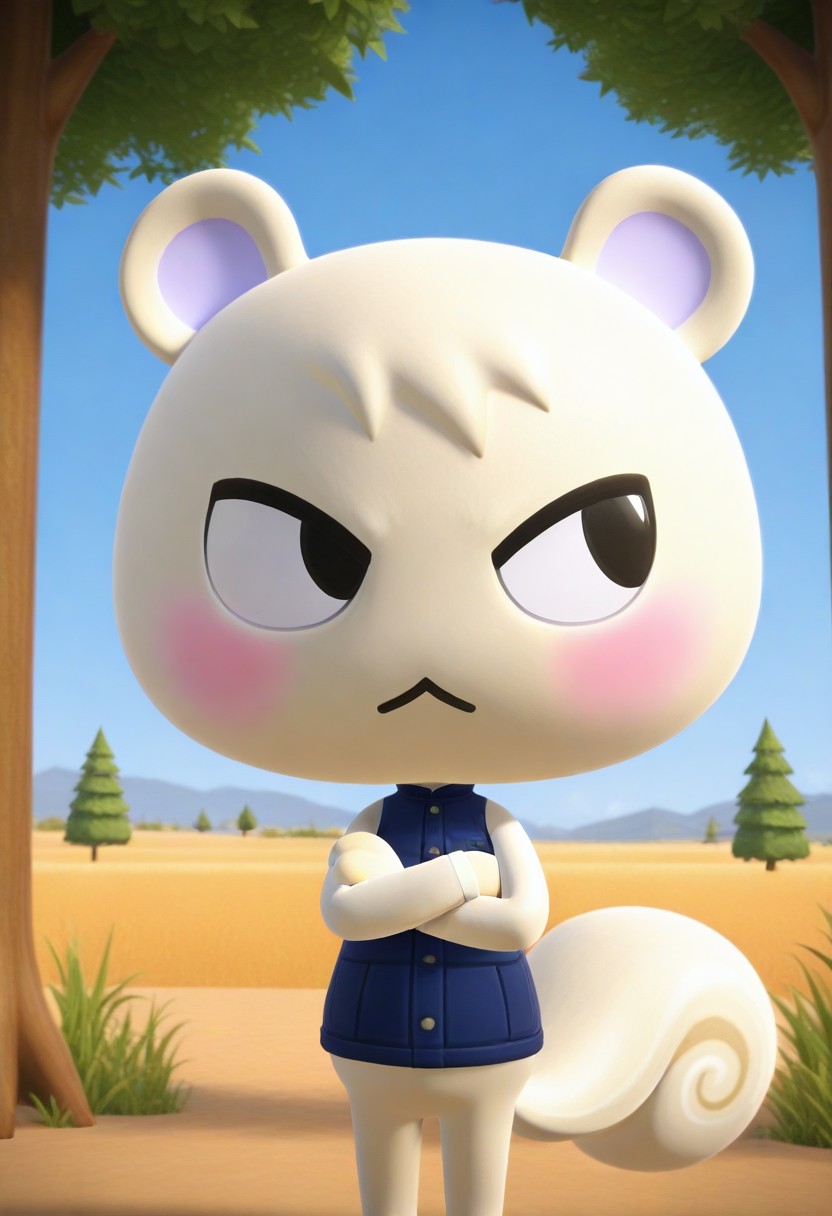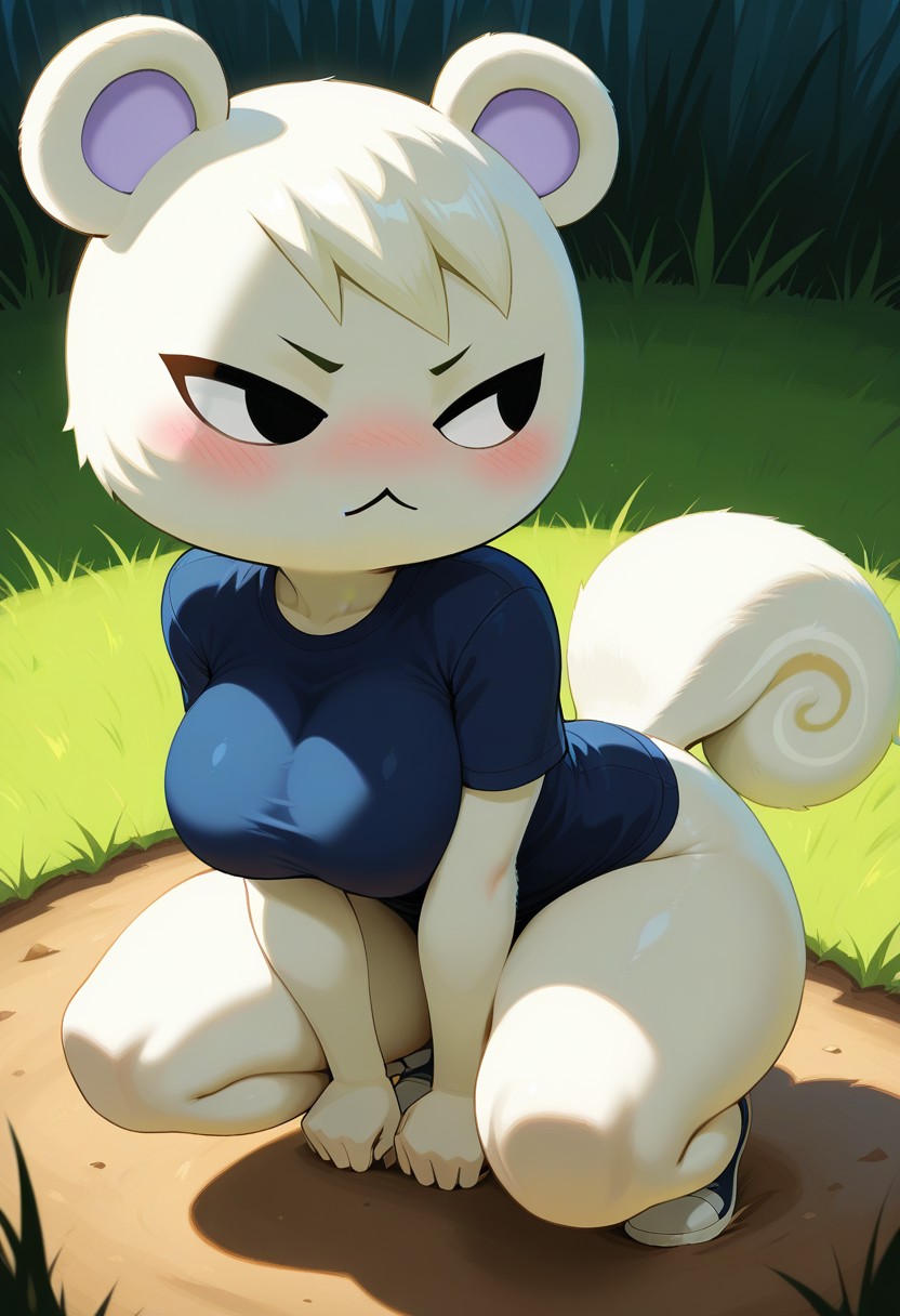 Marshal, white fur, black eyes, frown, bear ears, blush, white bushy tail, dark blue shirt